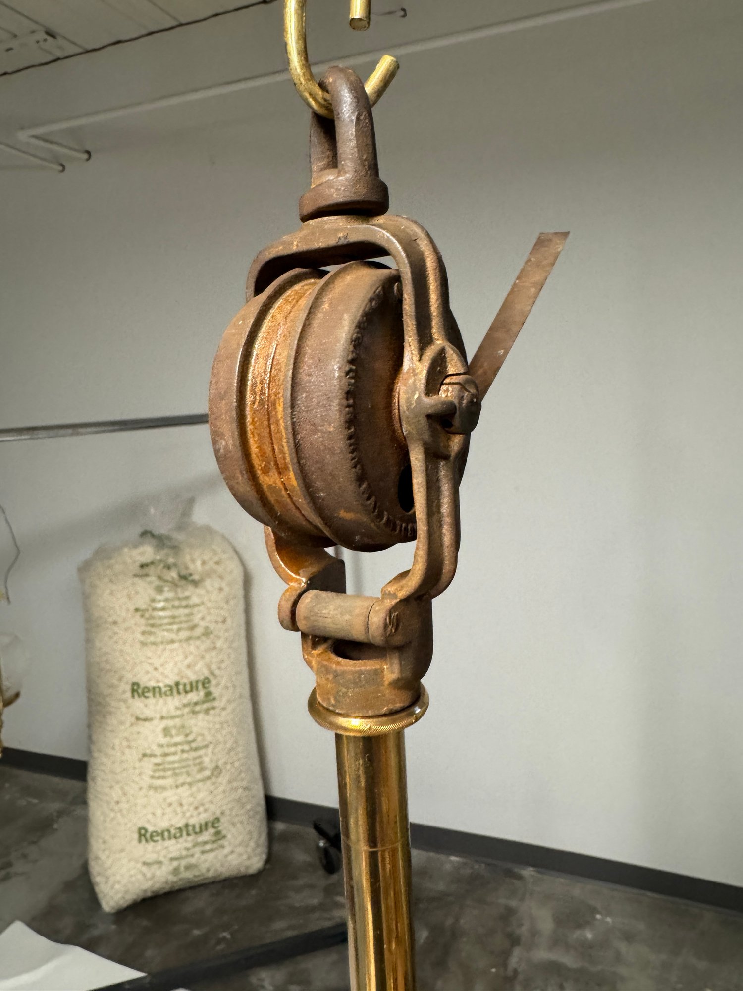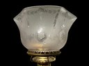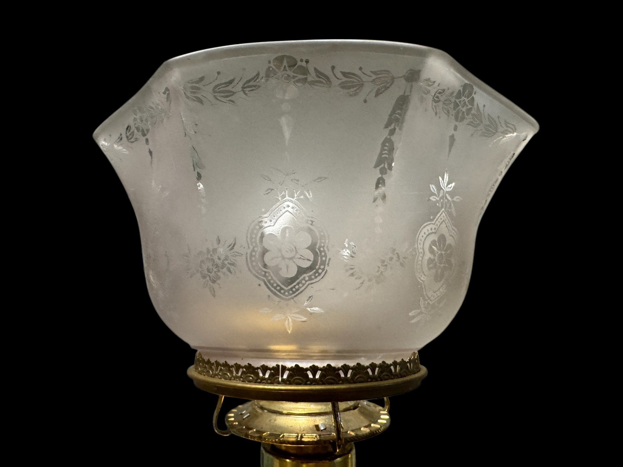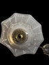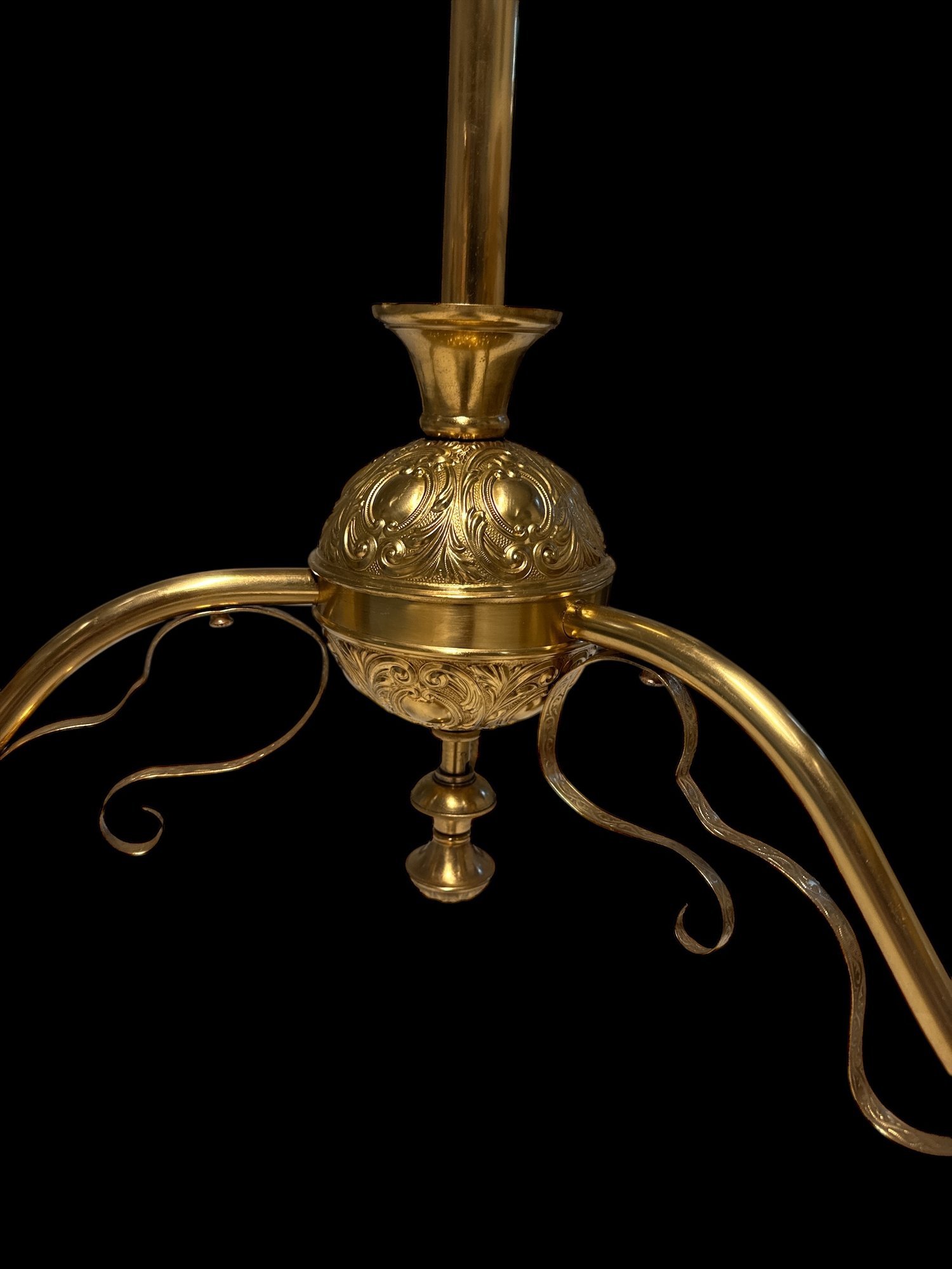 1870s Brass Oil Chandelier Original Chimneys Marked Acme Lead Flint. Burners have been hollowed out, but it has not been drilled for electricity. It measures 55" x 28"