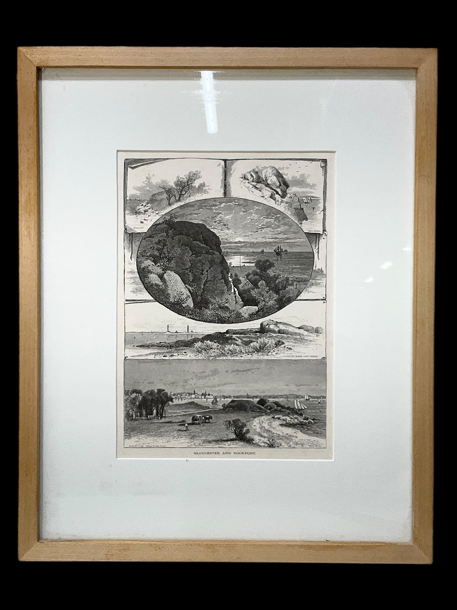 1870s Engravings From Picturesque America Of Gloucester And Rockport, back says 2 sided, with Norman’s Woe on the reverse, although we have not taken it out of the frame so we do not guarantee it. Sight size measures 10” x 7.”