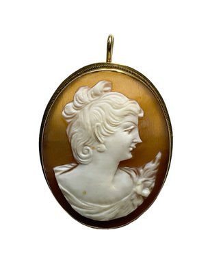 18K Gold set, Antique Cameo Pin or Pendant, this pendant is 1.5” tall, very fine iridescent carved pink shell. The loop can be worn up or down. Marked 750, tested and guaranteed to be 18K gold.