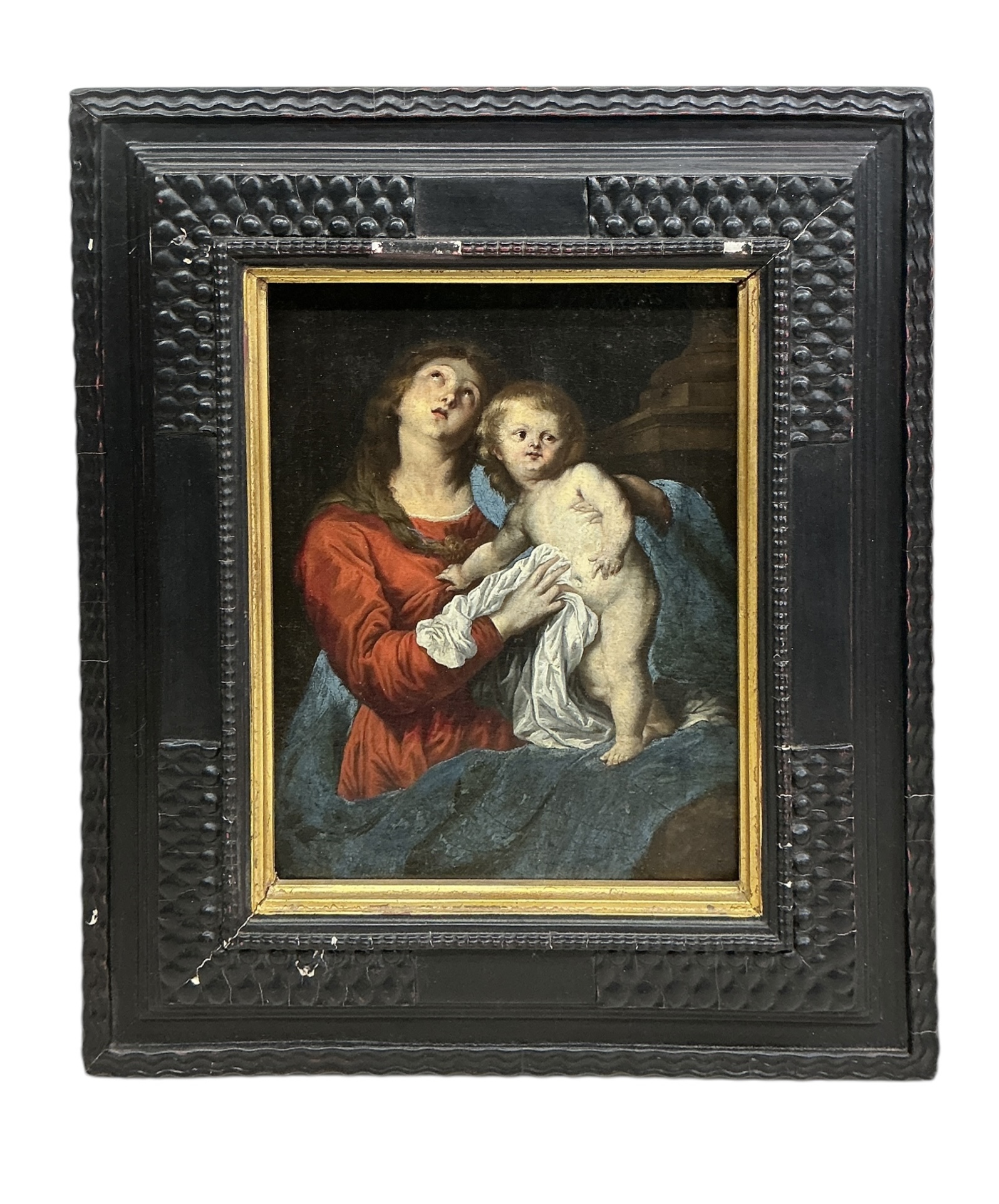 18th Century Oil Painting After Anthony Van Dyck Virgin And Child Canvas Laid On Panel. In good condition the frame is missing a couple of small pieces. Sight size is approx. 9” by 7” and frame size is approx. 14” by 12.” PLEASE NOTE, this is an original 18th Century painting on board, not a reproduction.