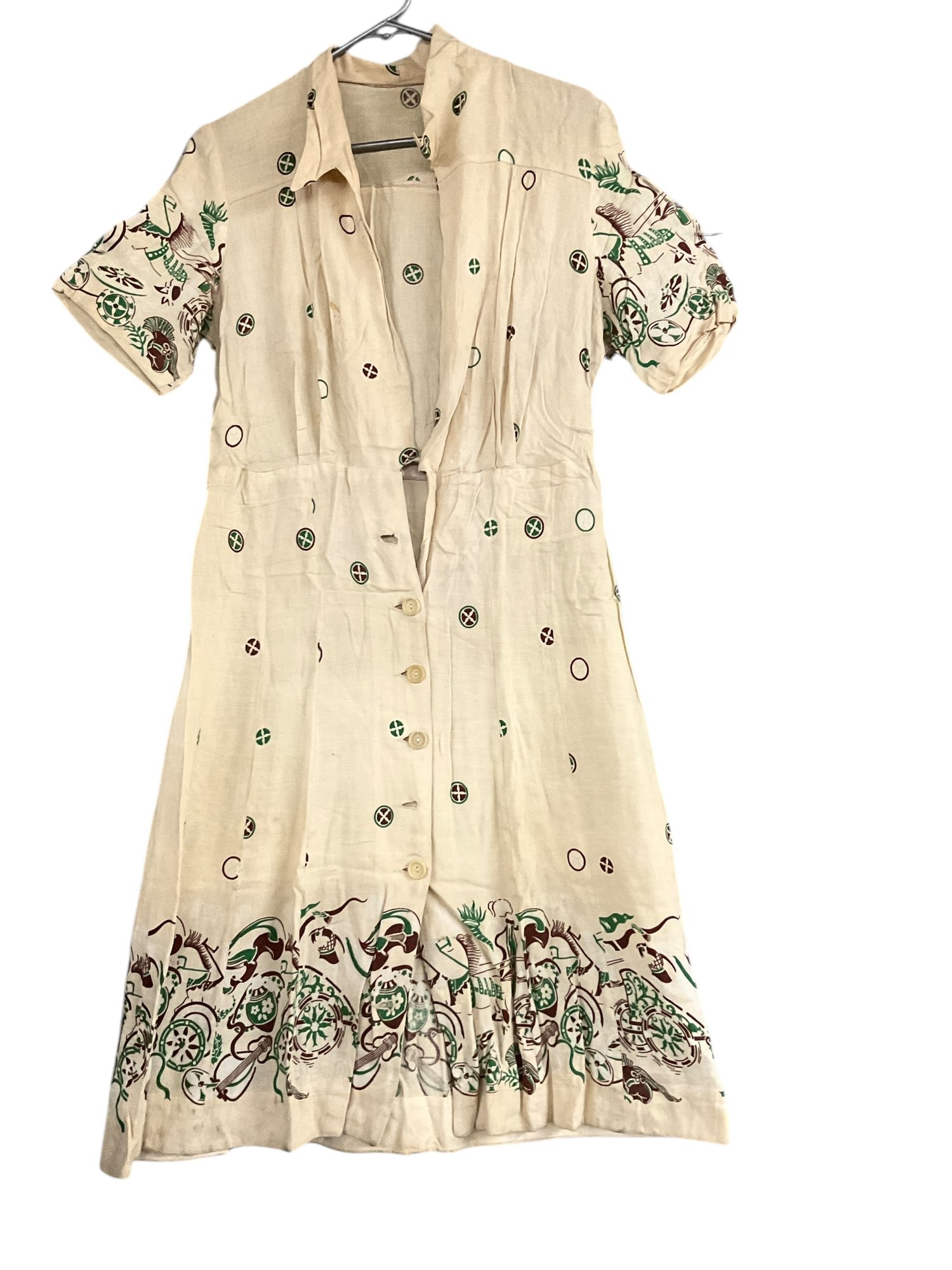 1930s/1940s Cream Dress Green & Brown Pattern, A slight tear in the underarm, a couple of small stains and a few missing buttons. From a smoke free and pet free environment.