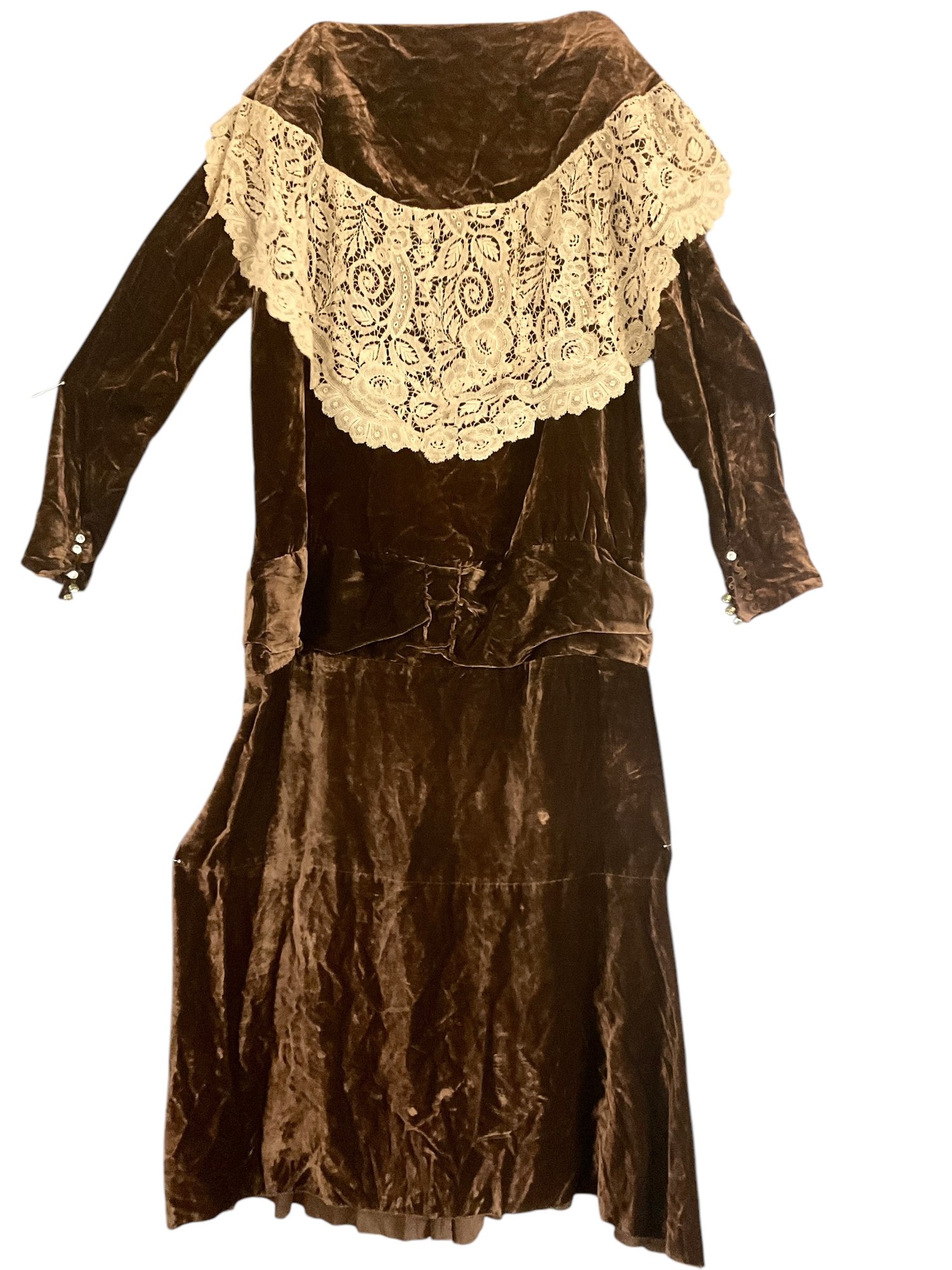 1930s Brown Tiered Velvet Drop Waist Dress, this has 2 small tears, otherwise in very good condition. From a smoke free and pet free environment.