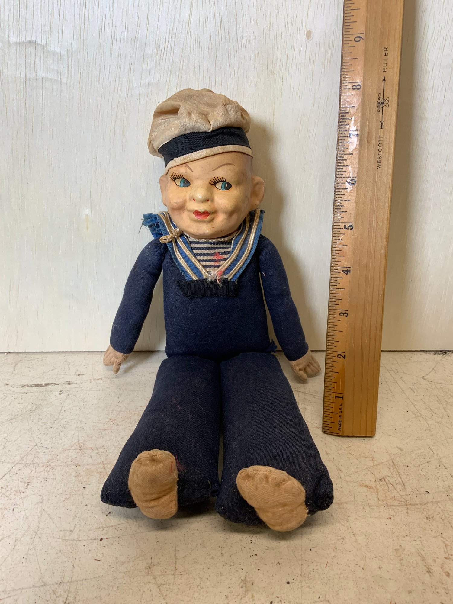 1930s Sailor Doll, measures approximately 12.” See photos for condition, mild discoloration and some general aging.