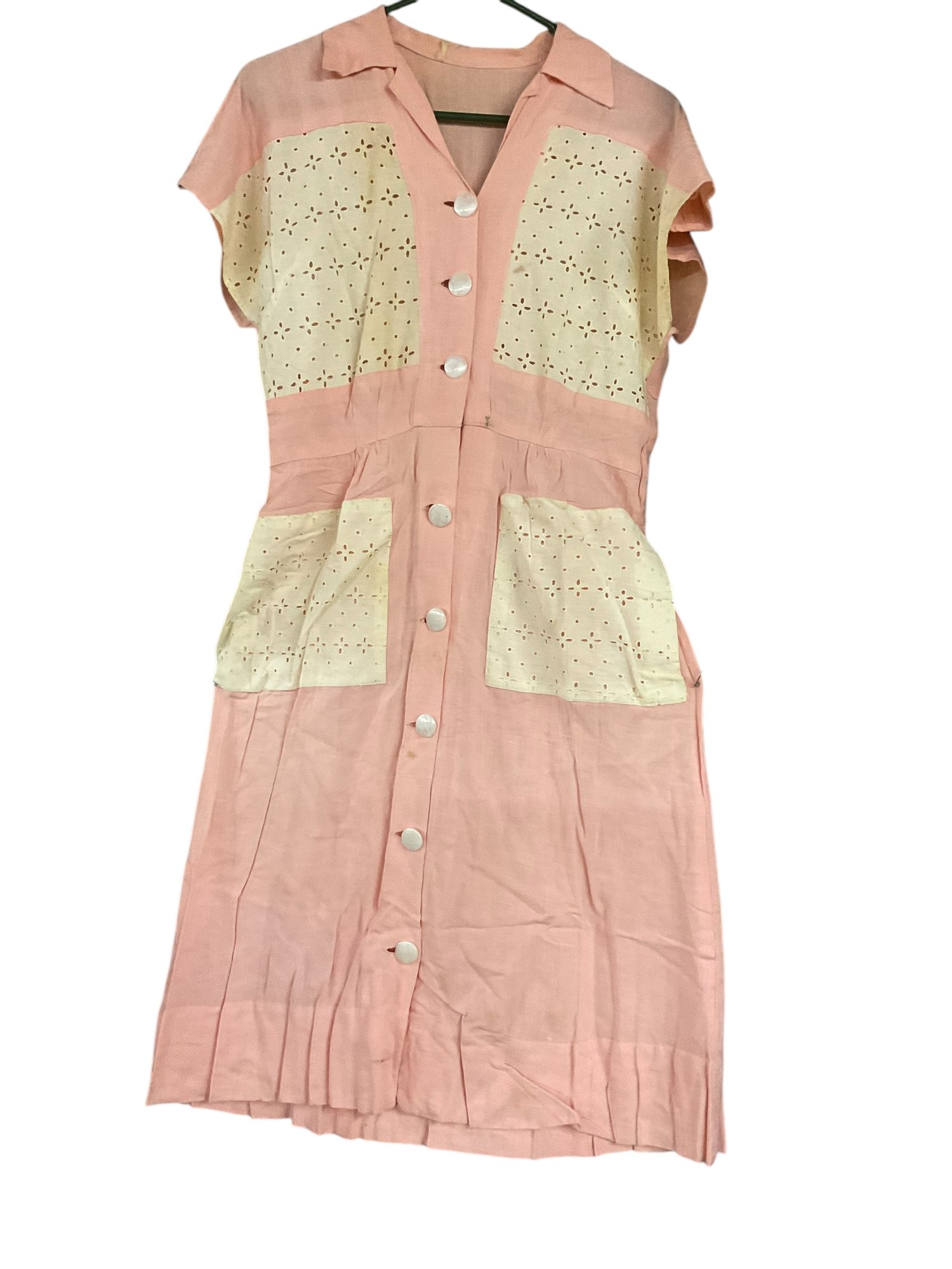 1940s Cotton Eyelet Pink And White Dress, Some faint discoloration, see photos. From a smoke free and pet free environment.
