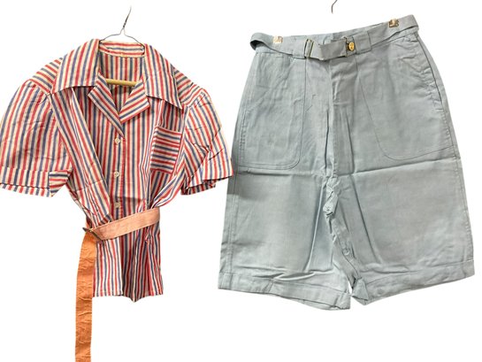 1940s Pinstripe Button Up & Knee Length Shorts Outfit, overall very good condition, a few blotches of discolor, by neck & left short pocket.