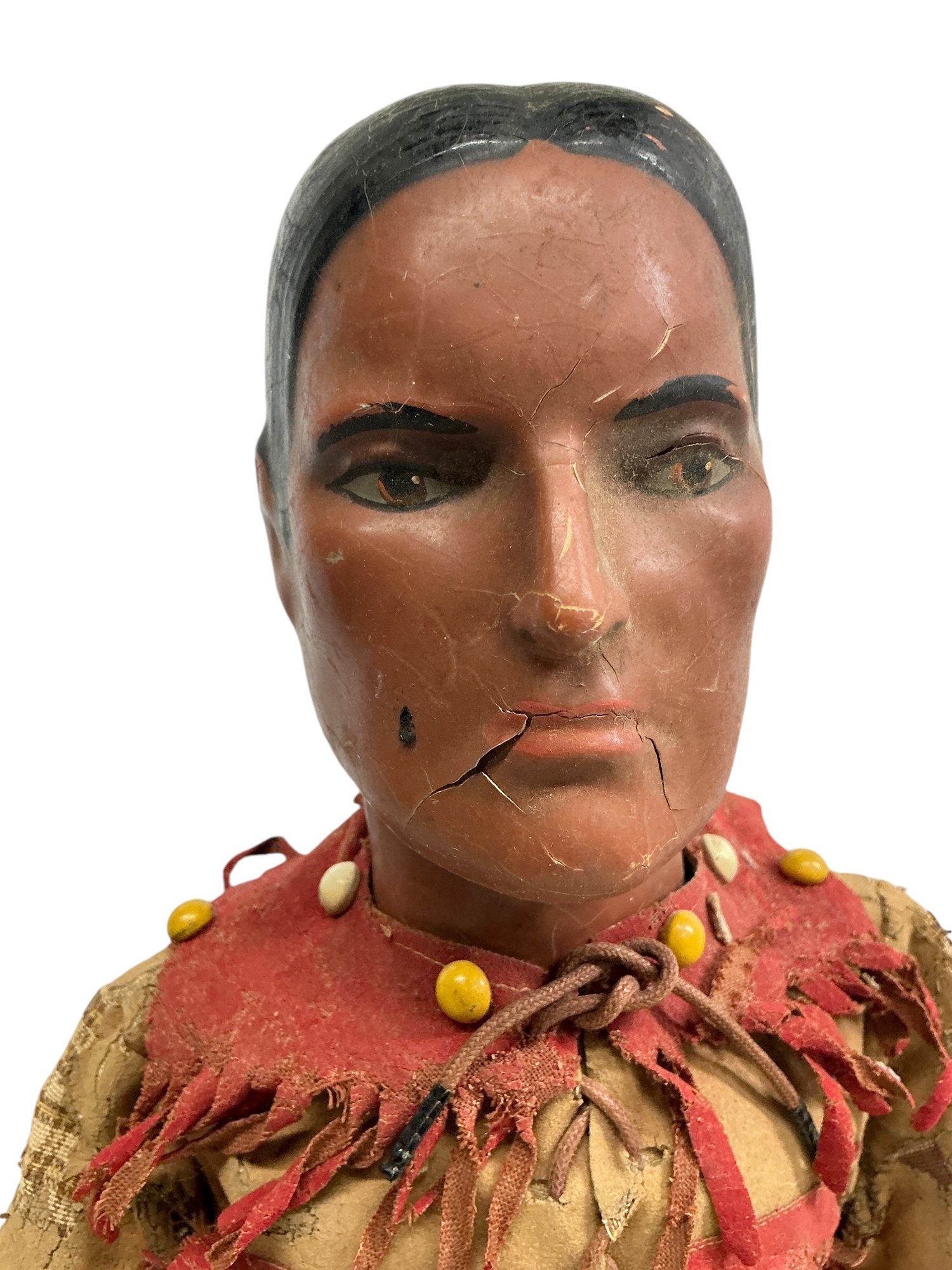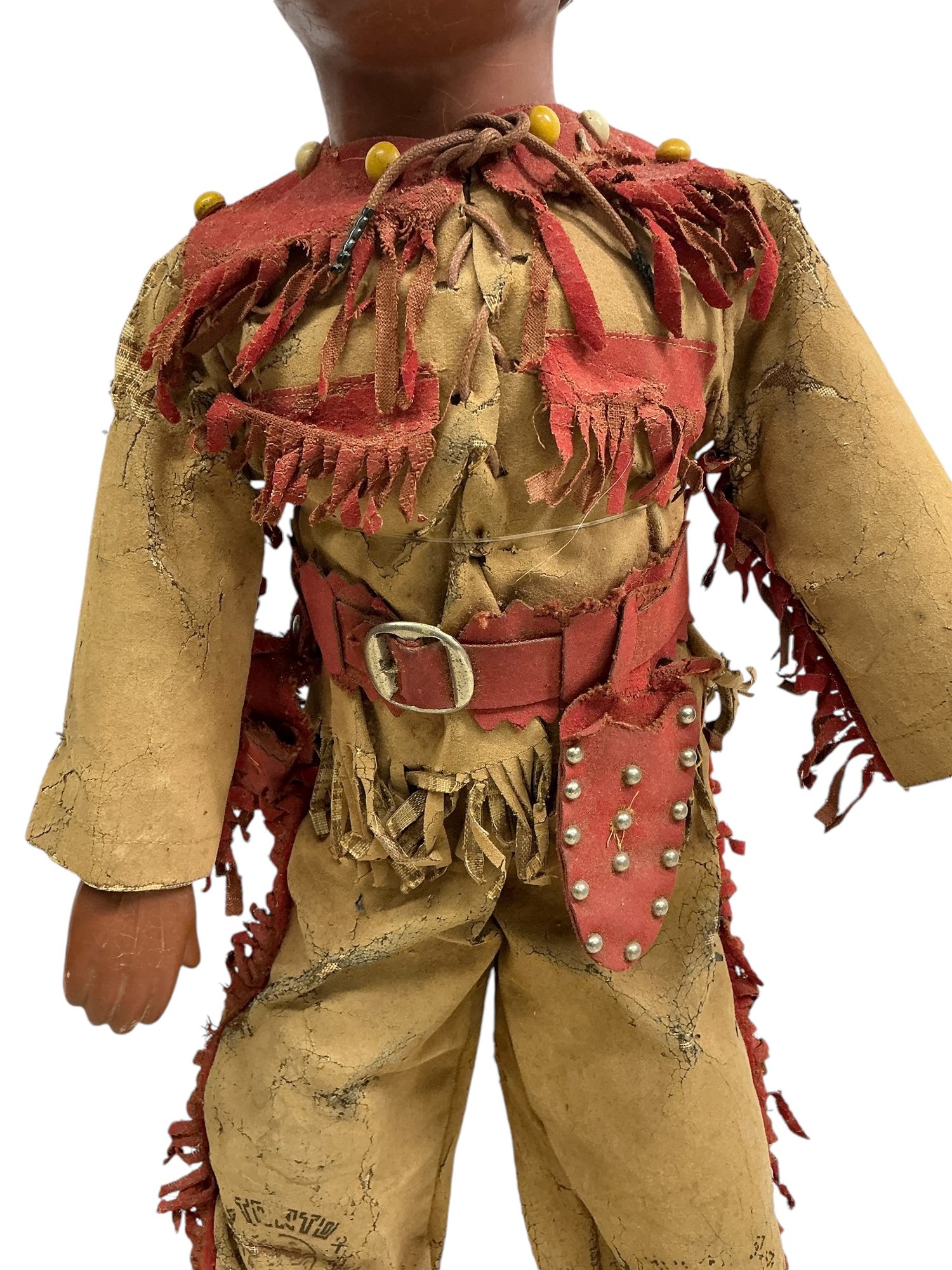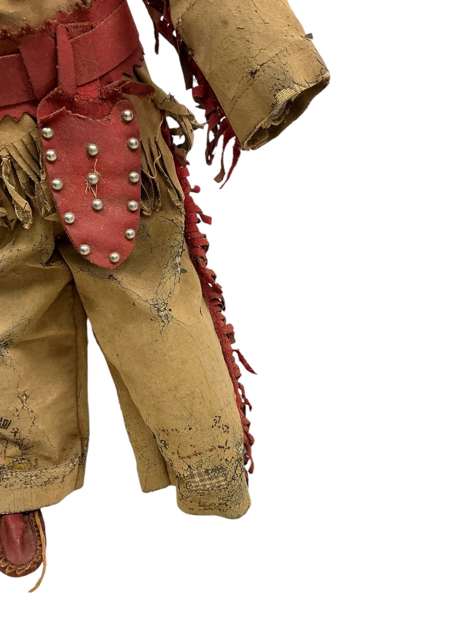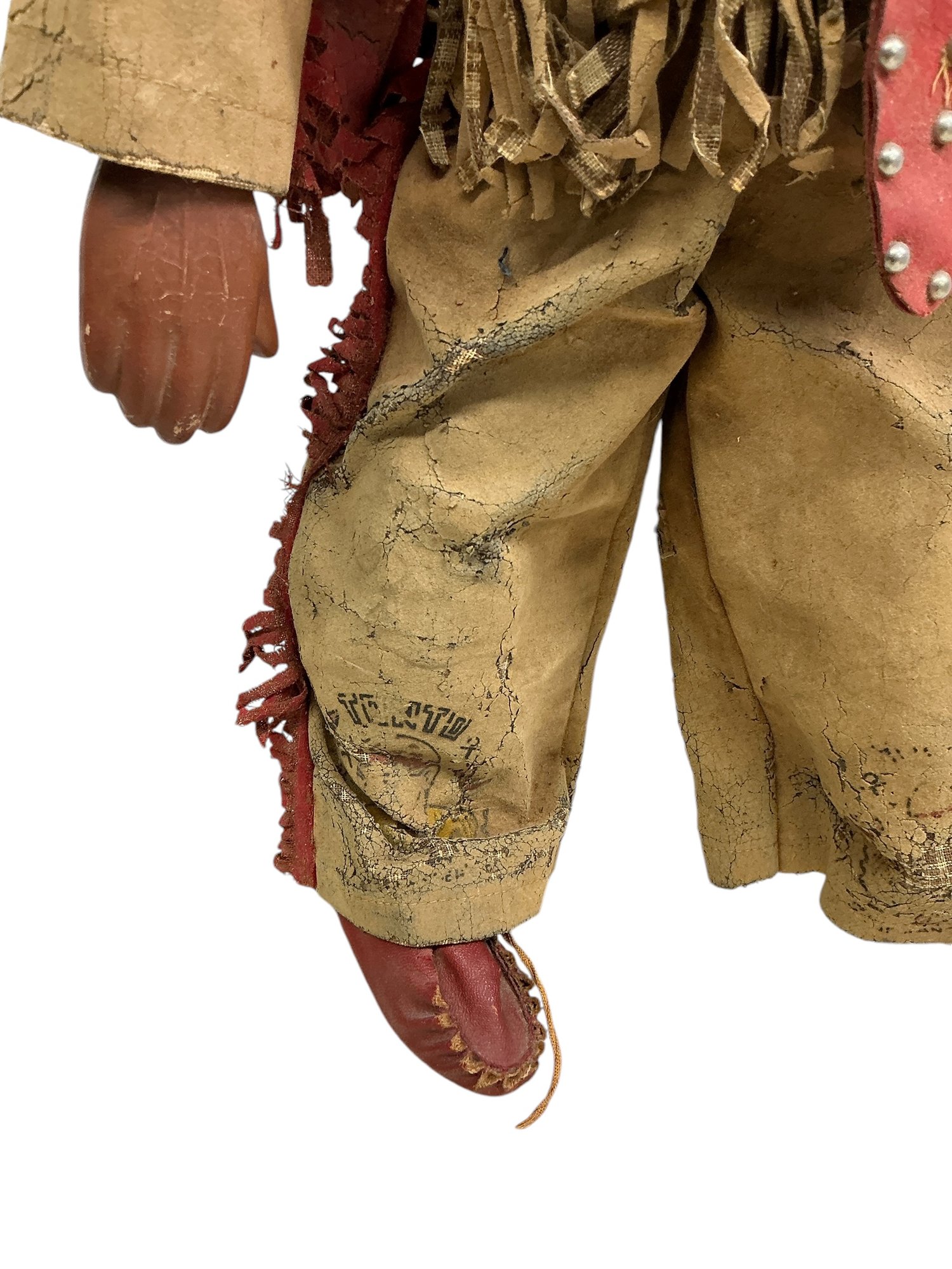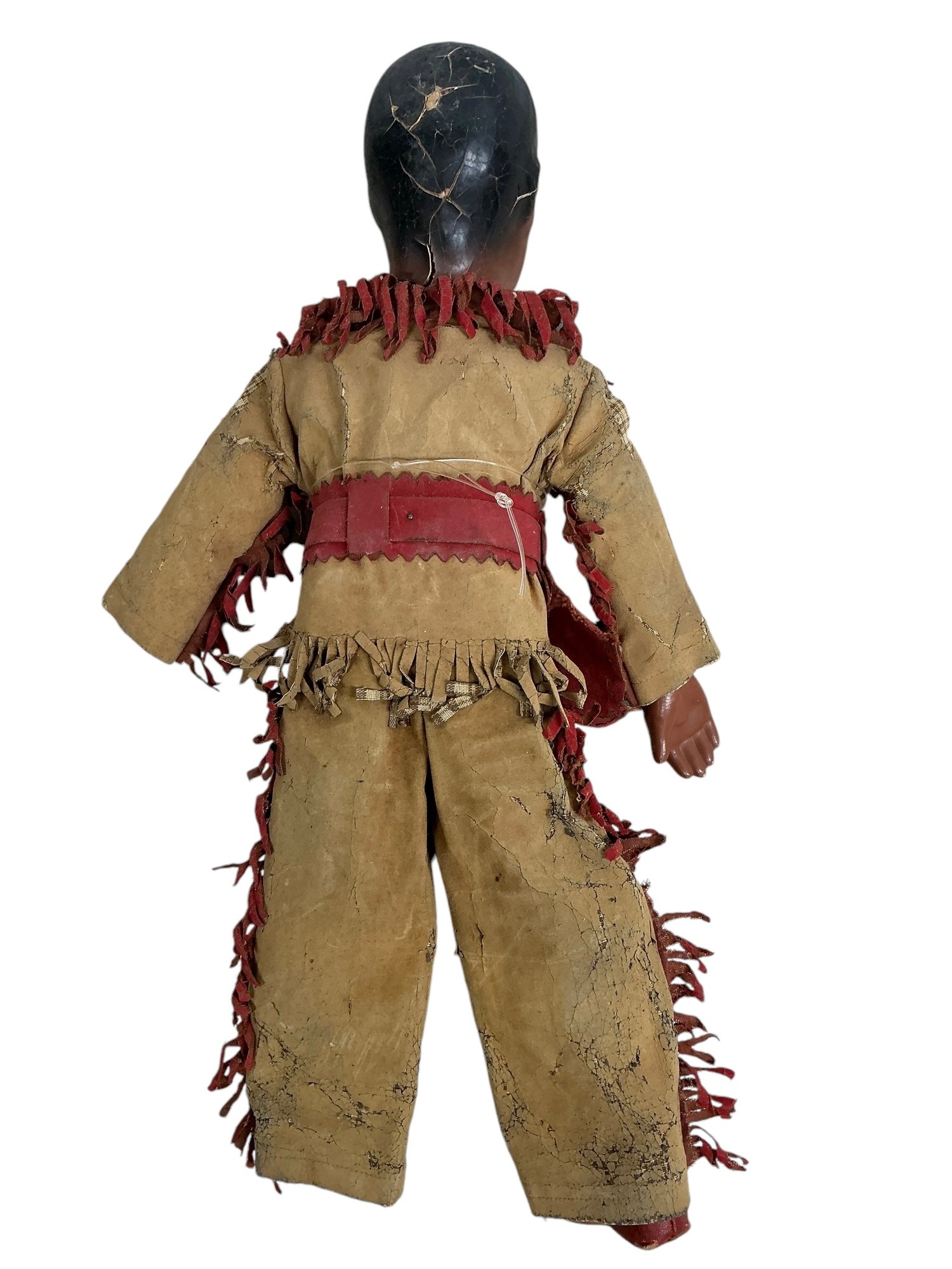 1940s Tonto Doll 20 Inches Tall Lone Ranger. In as-is condition with considerable cracking to the head, wear to the clothing, and a missing hand and foot, please see photos. It is approx. 20” tall.