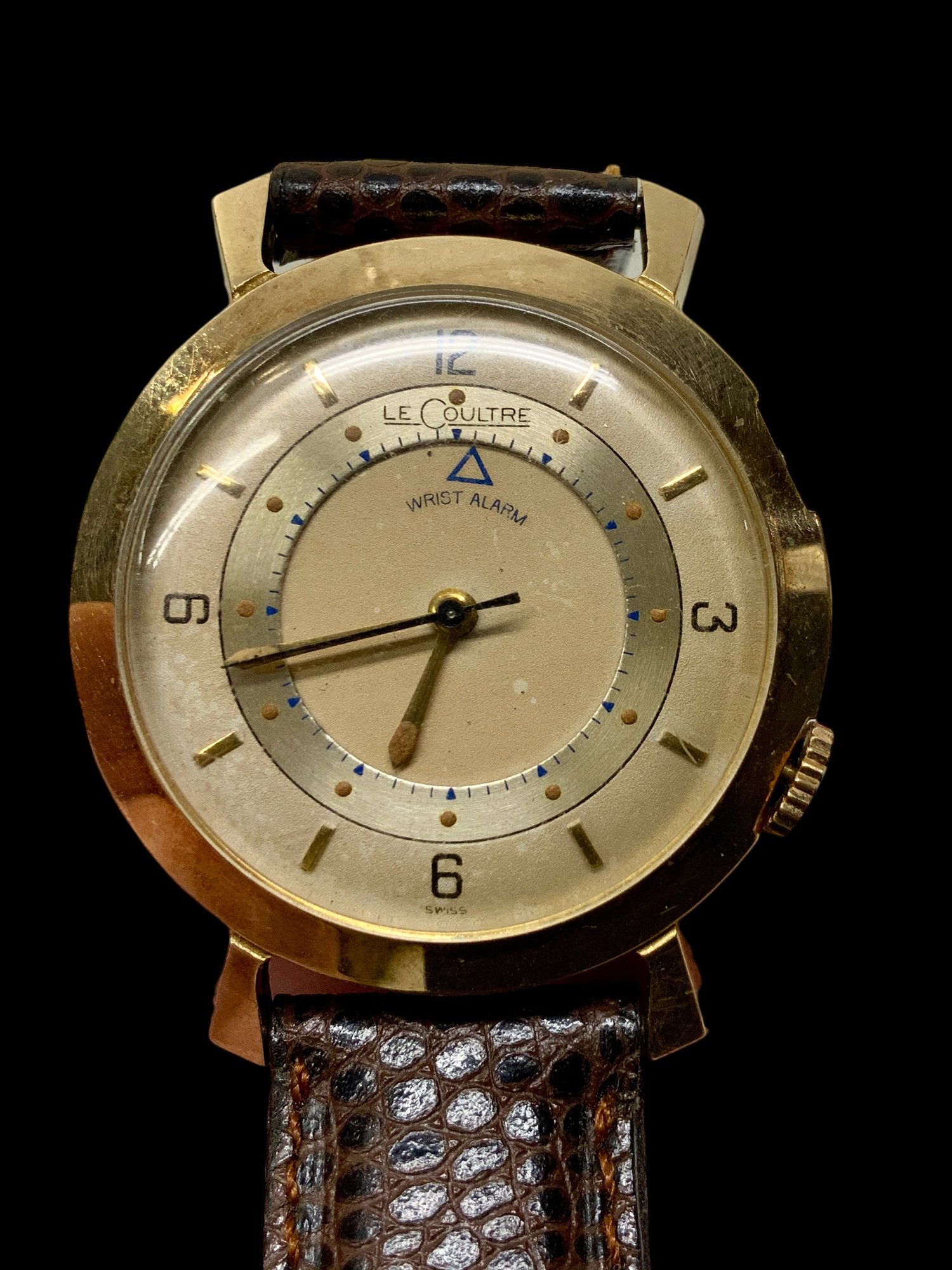 1950s Mens Le Coultre Wrist Watch Running, not timed for accuracy. This is missing the second crown for the alarm. Very attractive, no deep scratches.