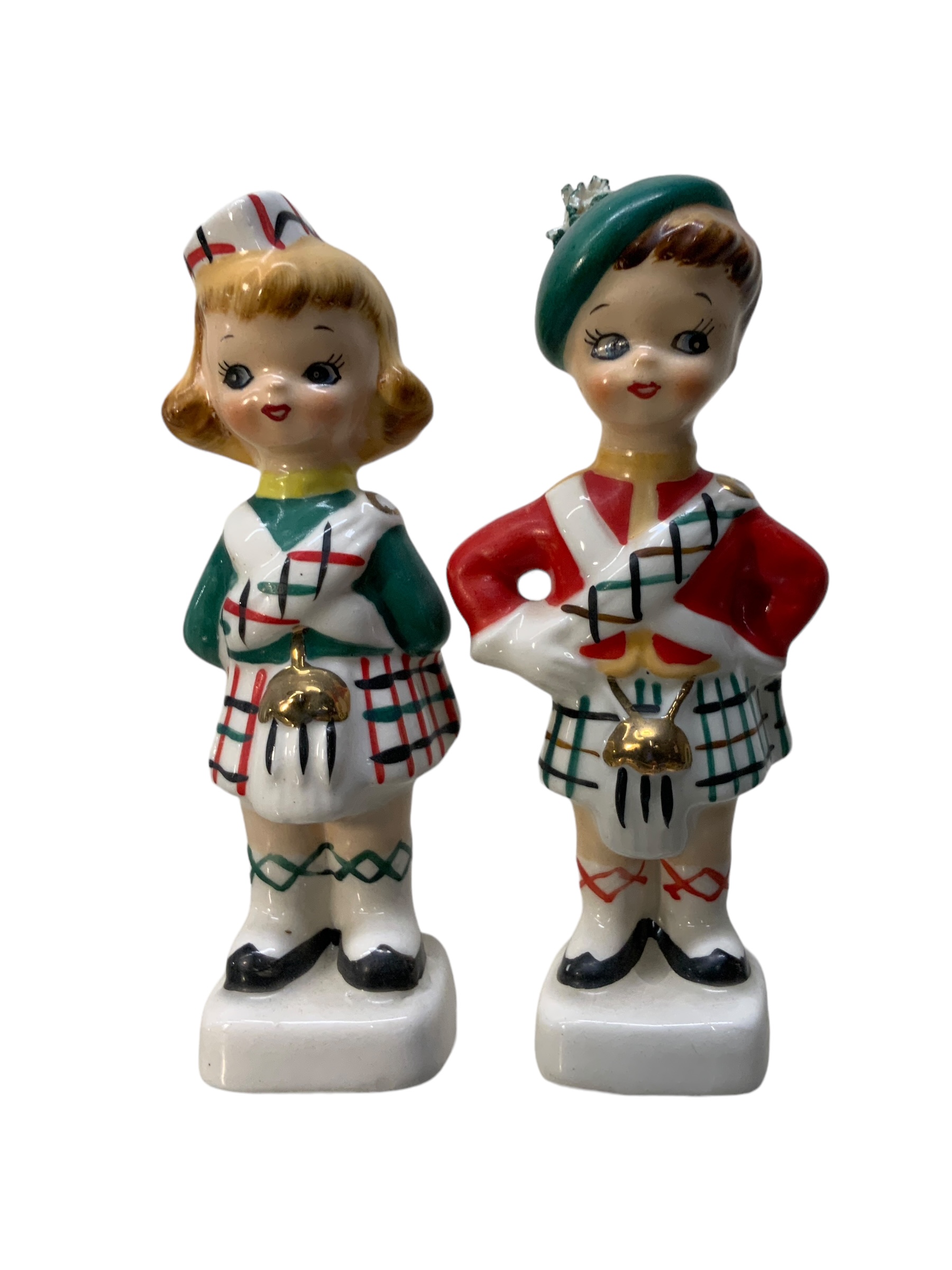 1950s Porcelain Salt And Pepper Shakers Scottish Girl And Boy, no damage, 4.5” tall.