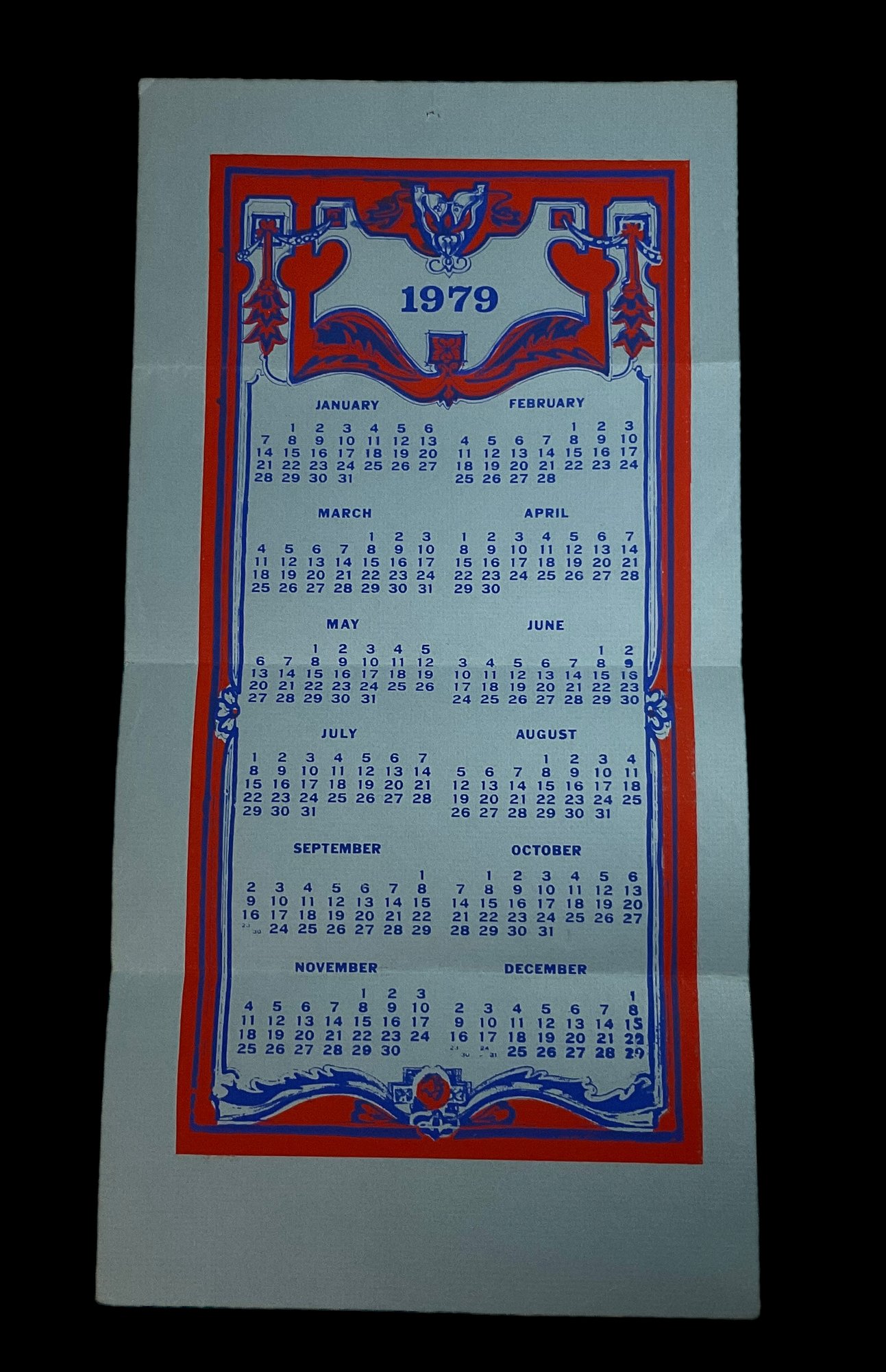 1979 Fold Out Calendar Woodblock Ephemera, Thank you note on reverse. Measures 21.5 x 10.5 inches folded out.