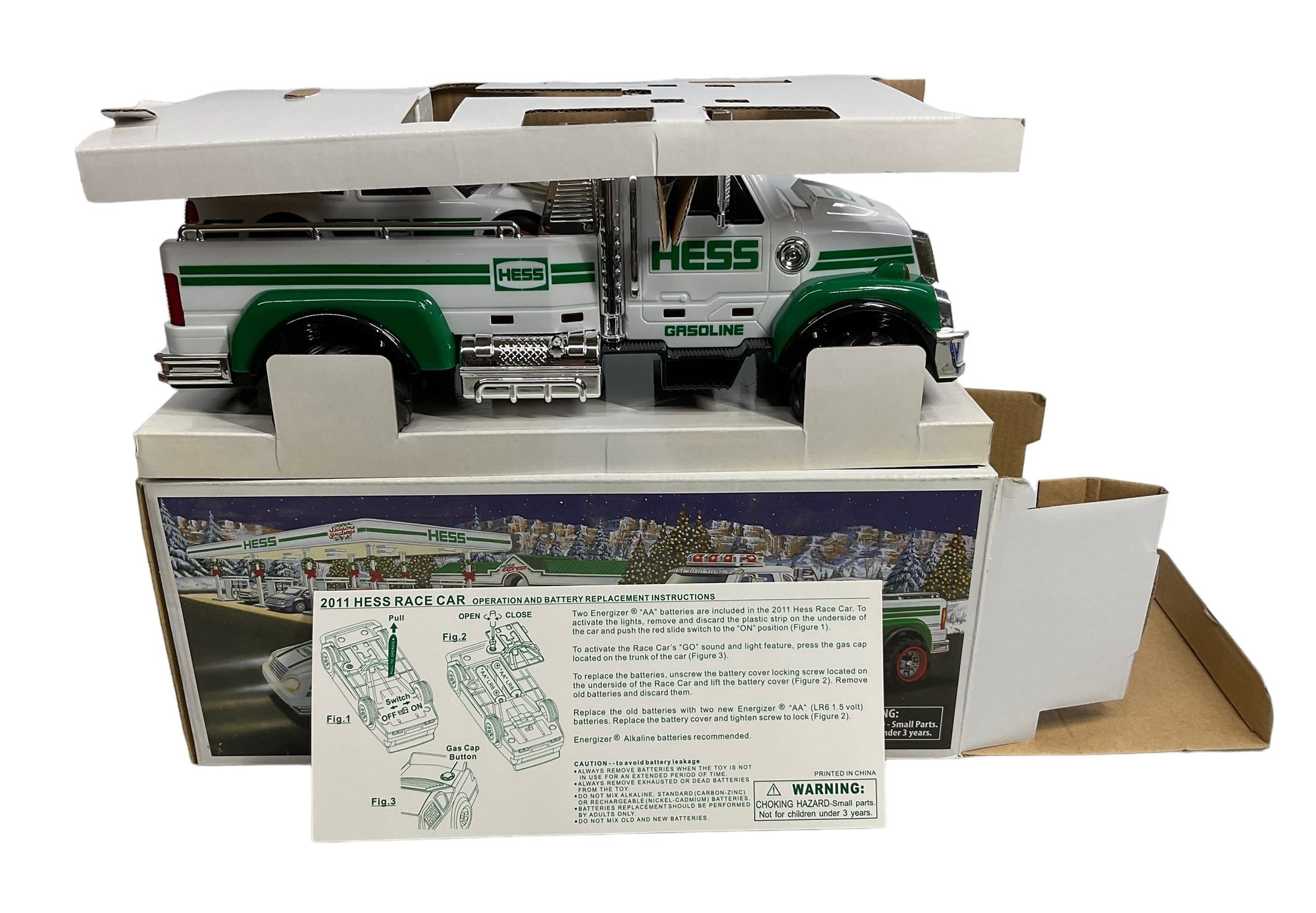 2011 Hess Toy Truck And Race Car Set In Box. In good condition. The box is 12.5” by 5.5” by 5”.