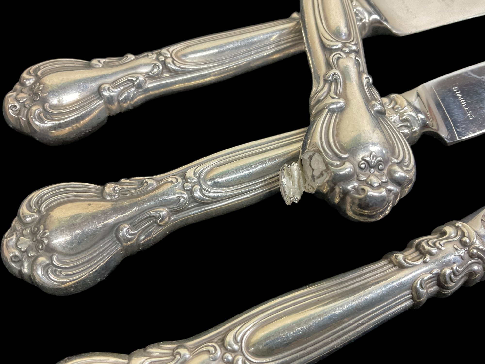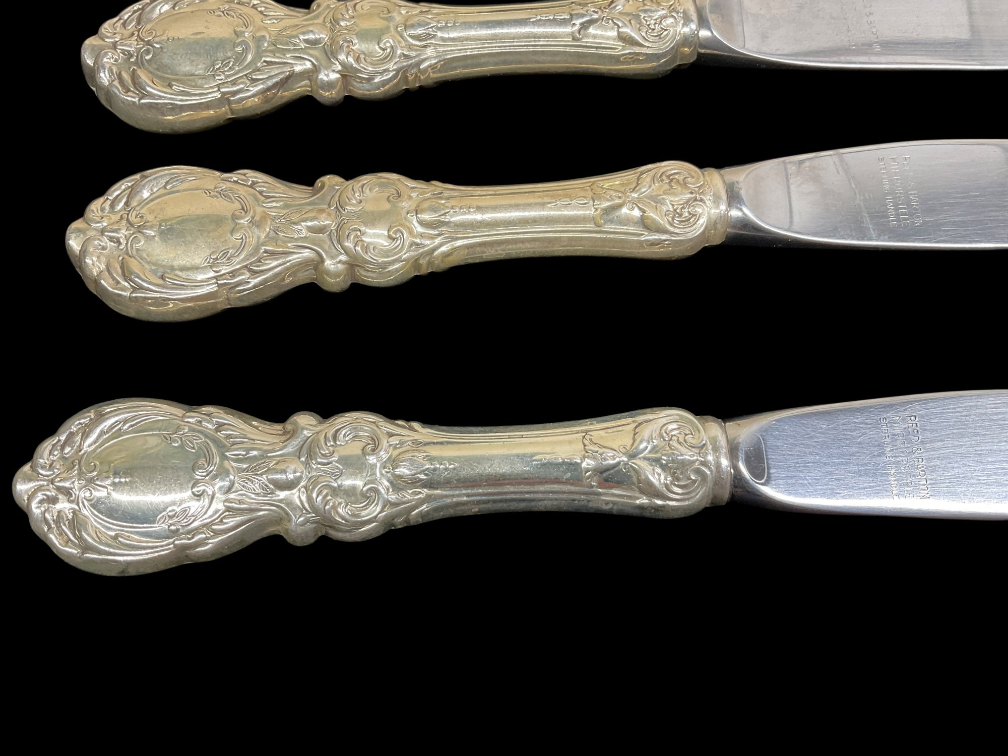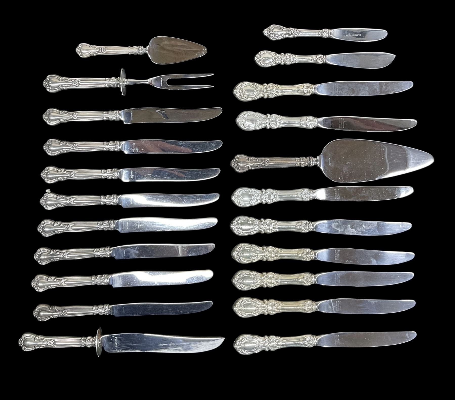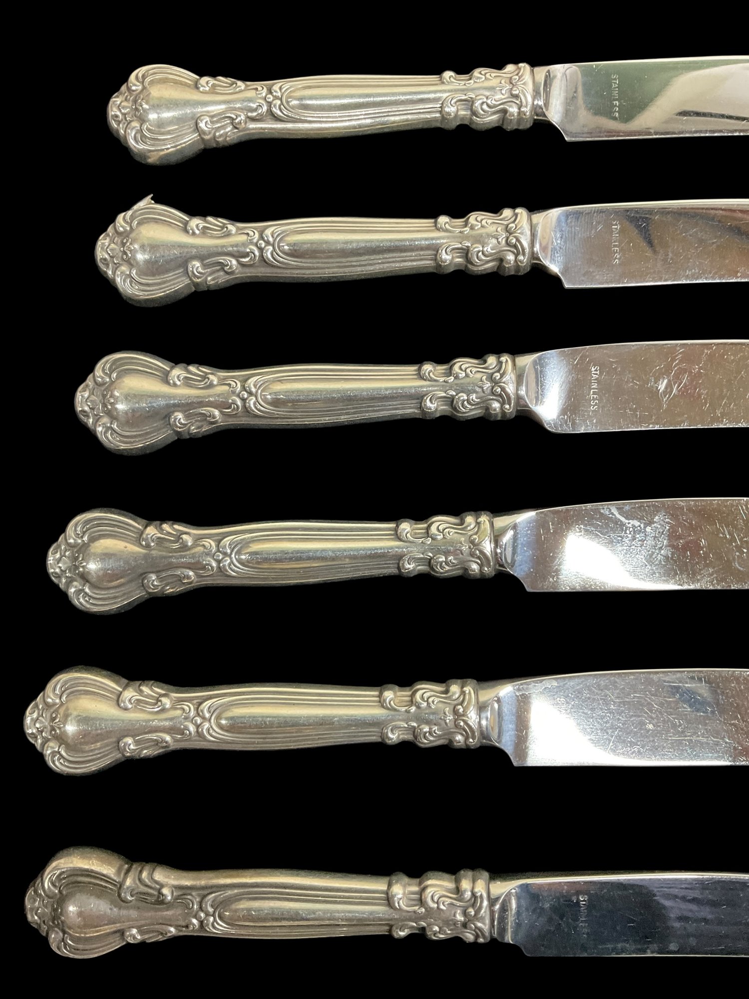 Lot Of 22 pcs Sterling Handle Flatware Including Dinner Knives Reed And Barton Mirrorstele. All in good condition except one knife handle has some damage, please see photos.