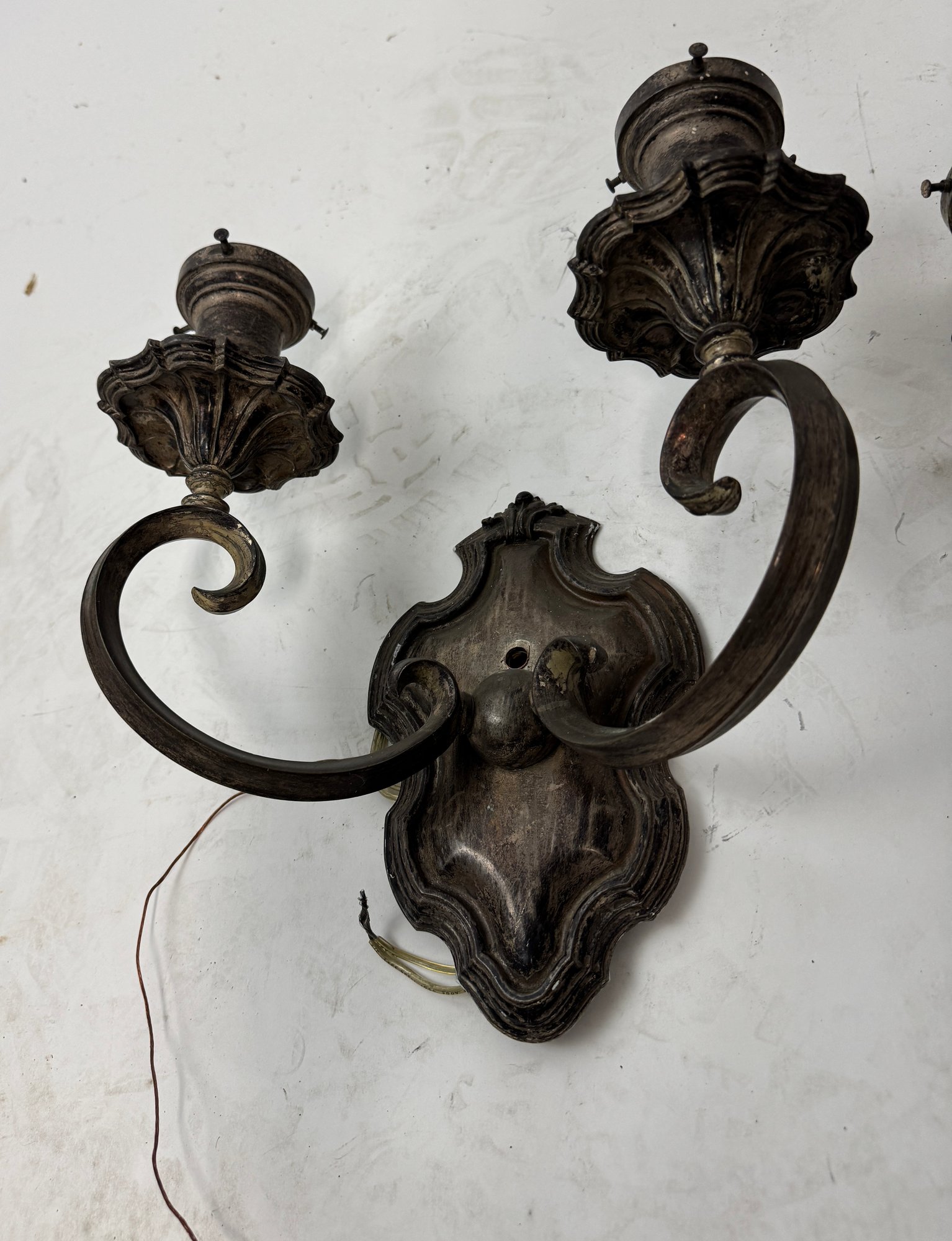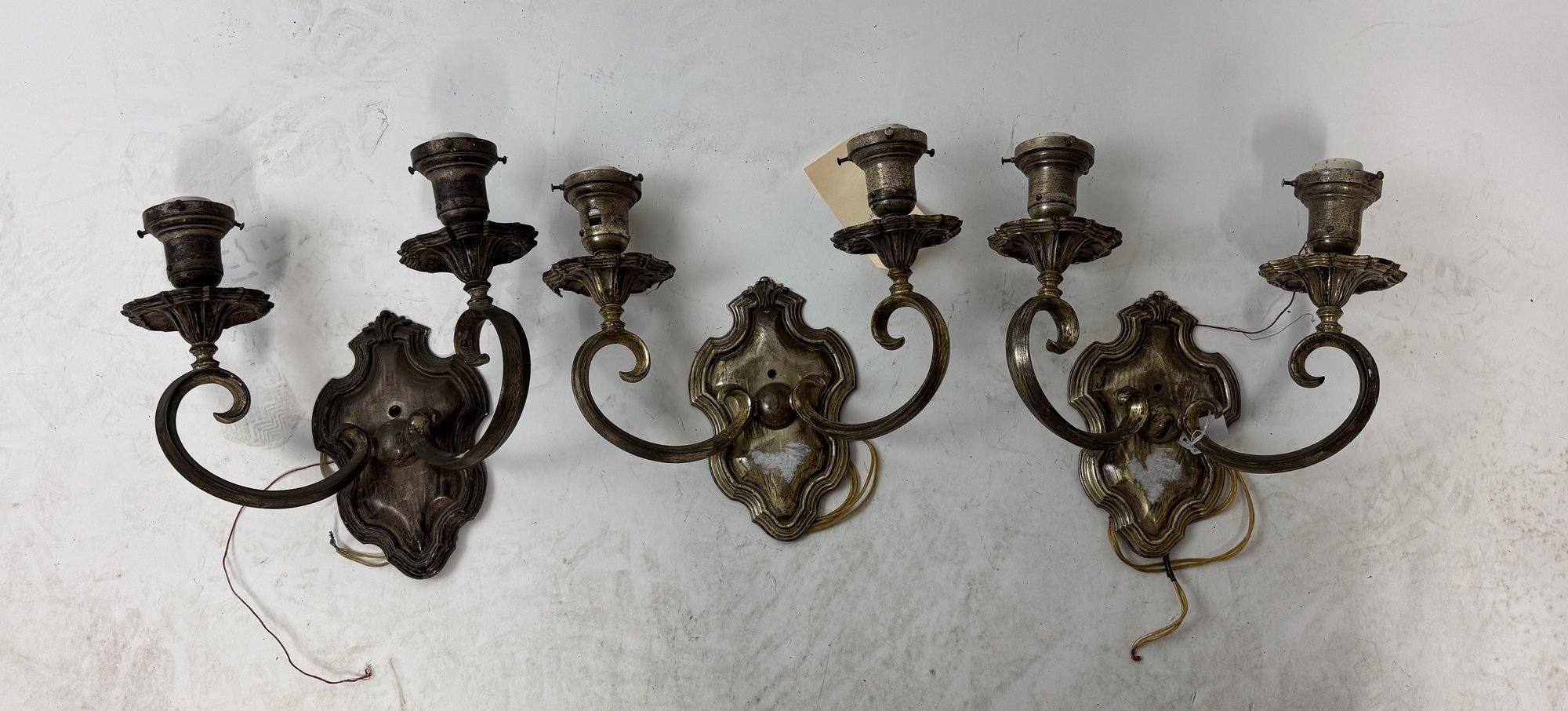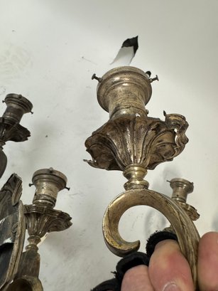3 Antique Silverv plate Wall Sconces by E F Caldwell early 20th century as found, one has a bit of metal damage see pics. These measure 13" x 12" 6"