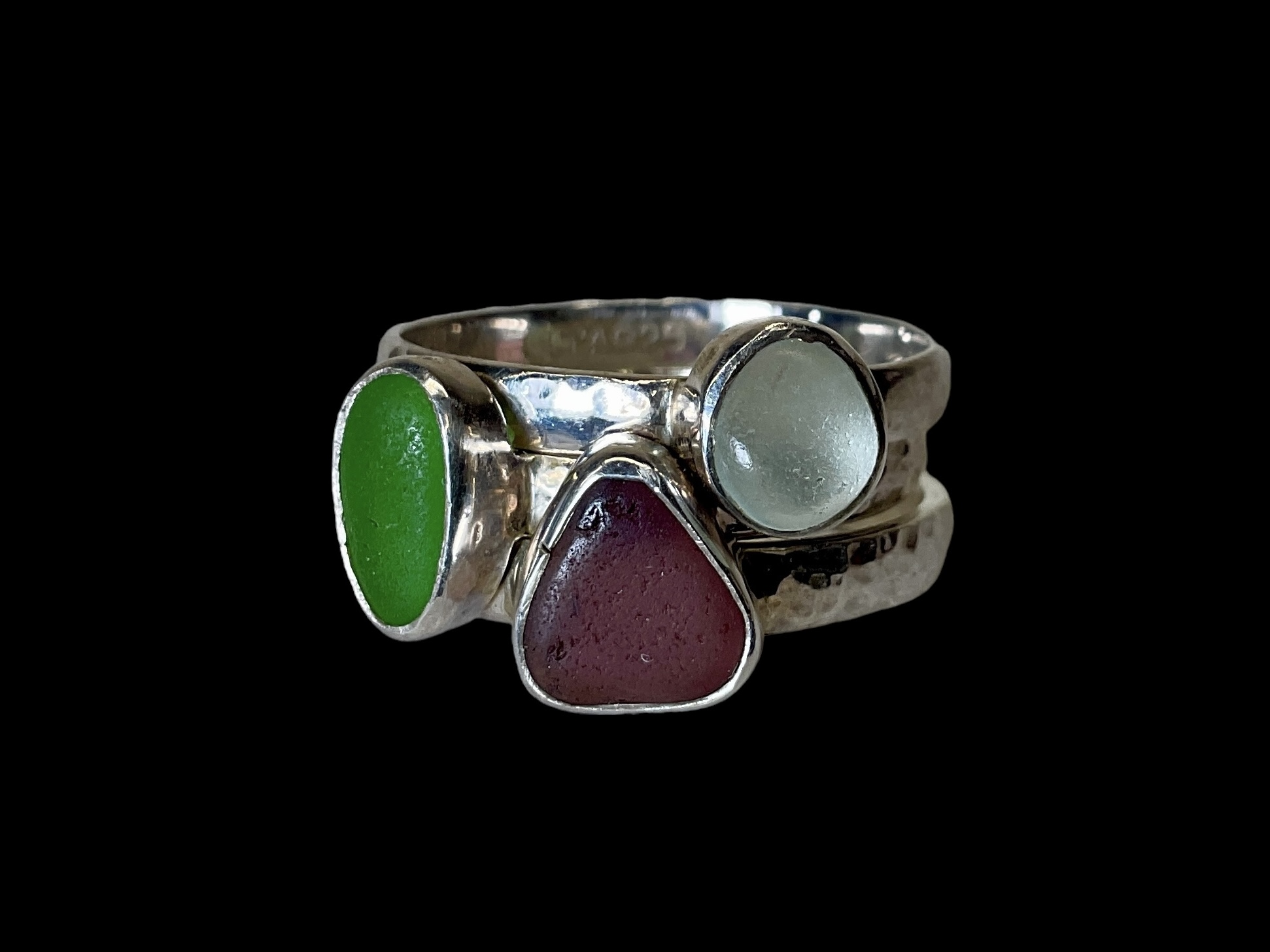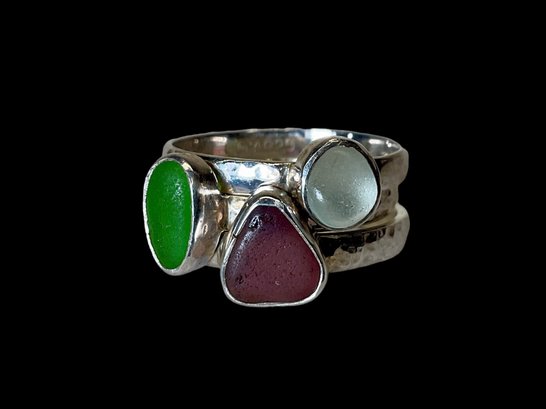 3 Sterling And Sea Glass Size 10 Stacking Rings, marked sterling.