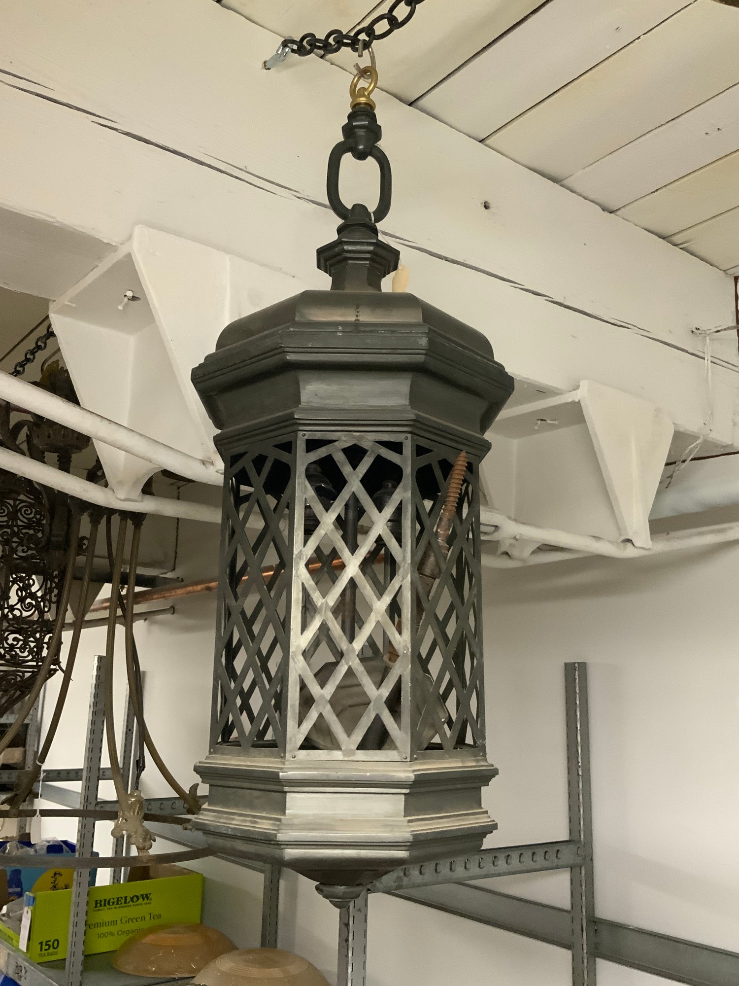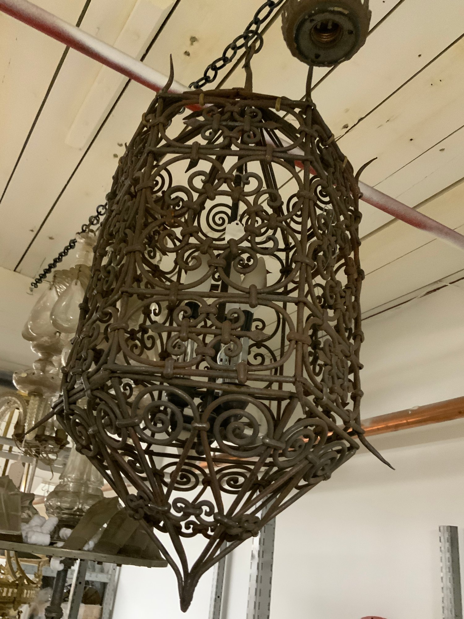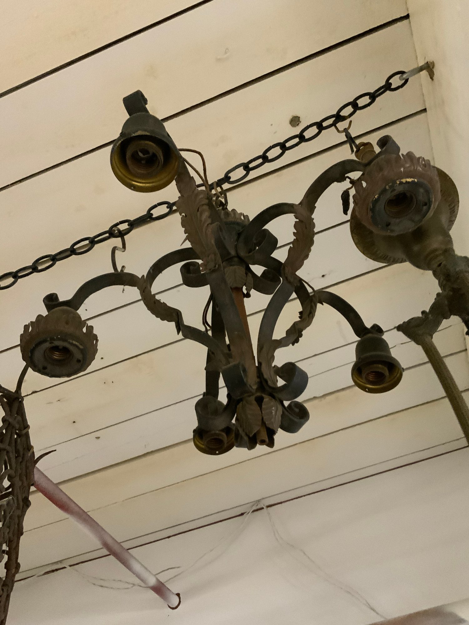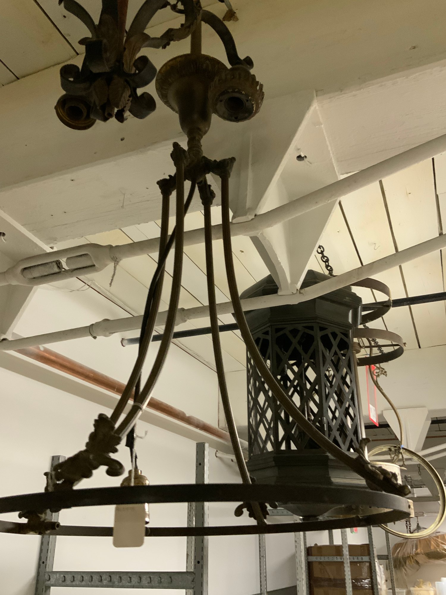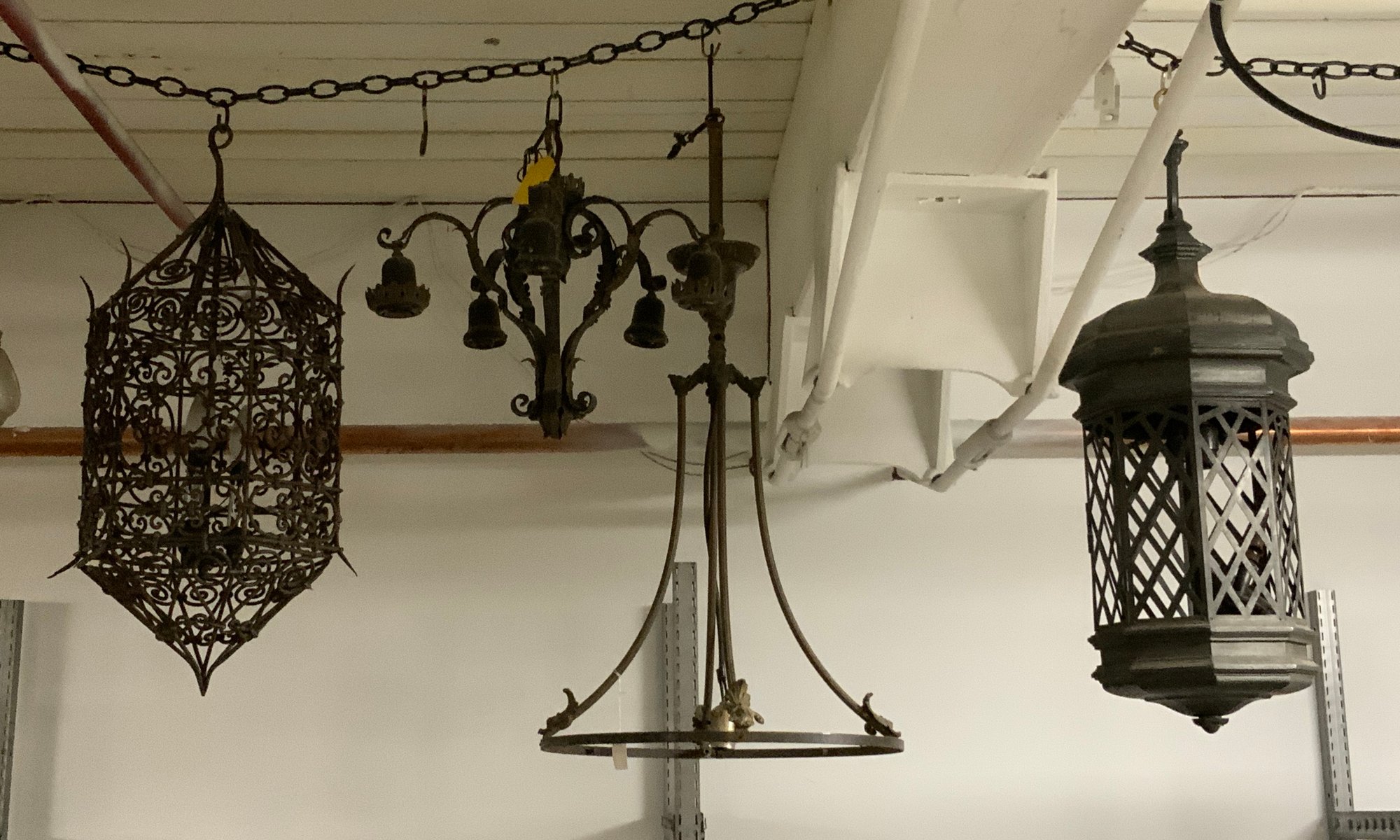 4 Antique And Vintage Metal Chandeliers Lanterns And Lamps. Being sold as found and as-is with various missing pieces and parts, not wired, etc. Largest is approx. 30” tall x 18" diameter.