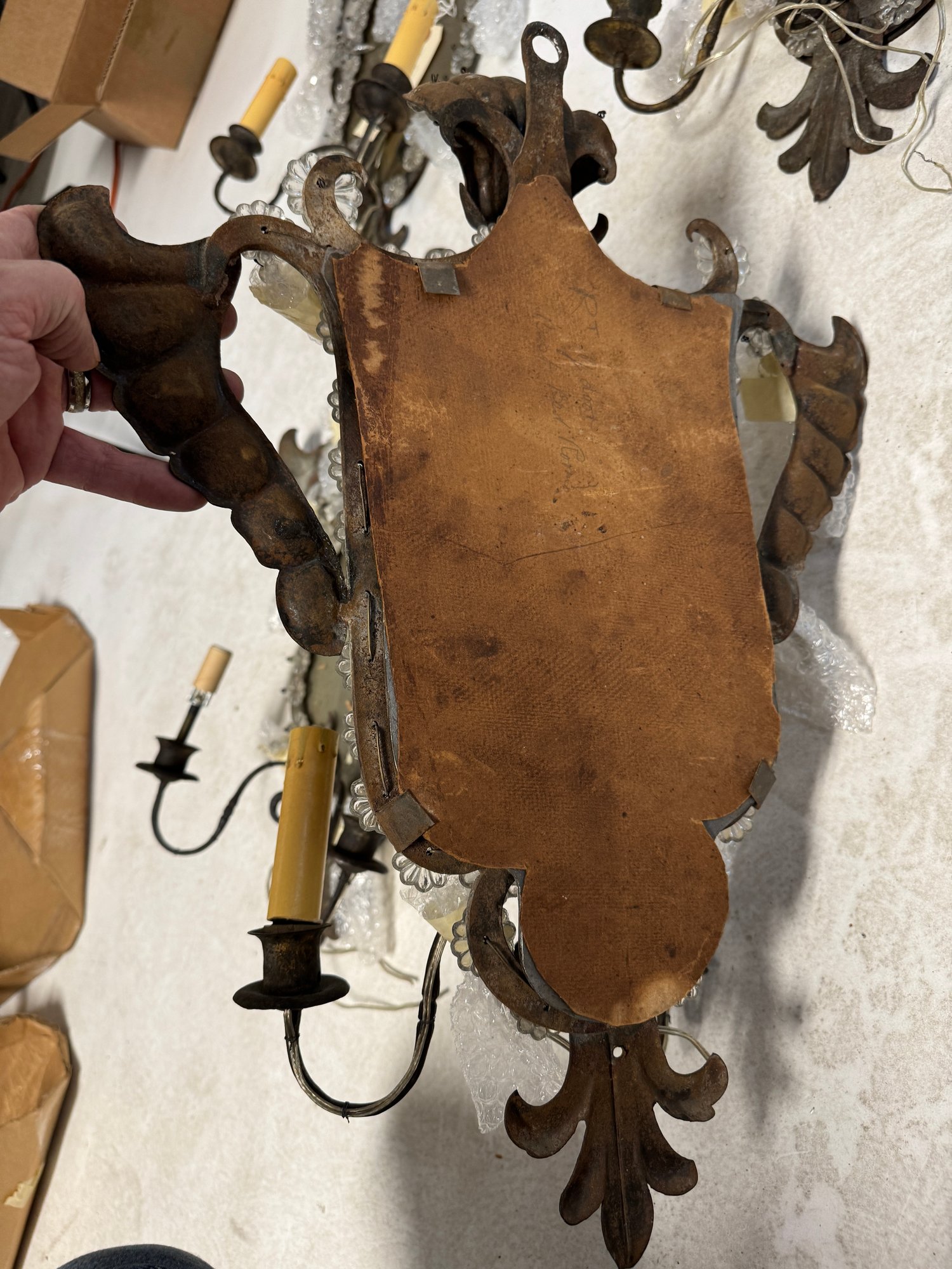4 Matching 19th century Venetian Mirrored & Crystal Sconces tole, Antique gold Paint. We LOVE these! They are so legitimate. First off, they need some tightening and tweaking, and there may some nicks or chips to the crystal, but none that we've noticed so far. (all the bobeches were bubble wrapped long ago, and we have not unwrapped them.)
