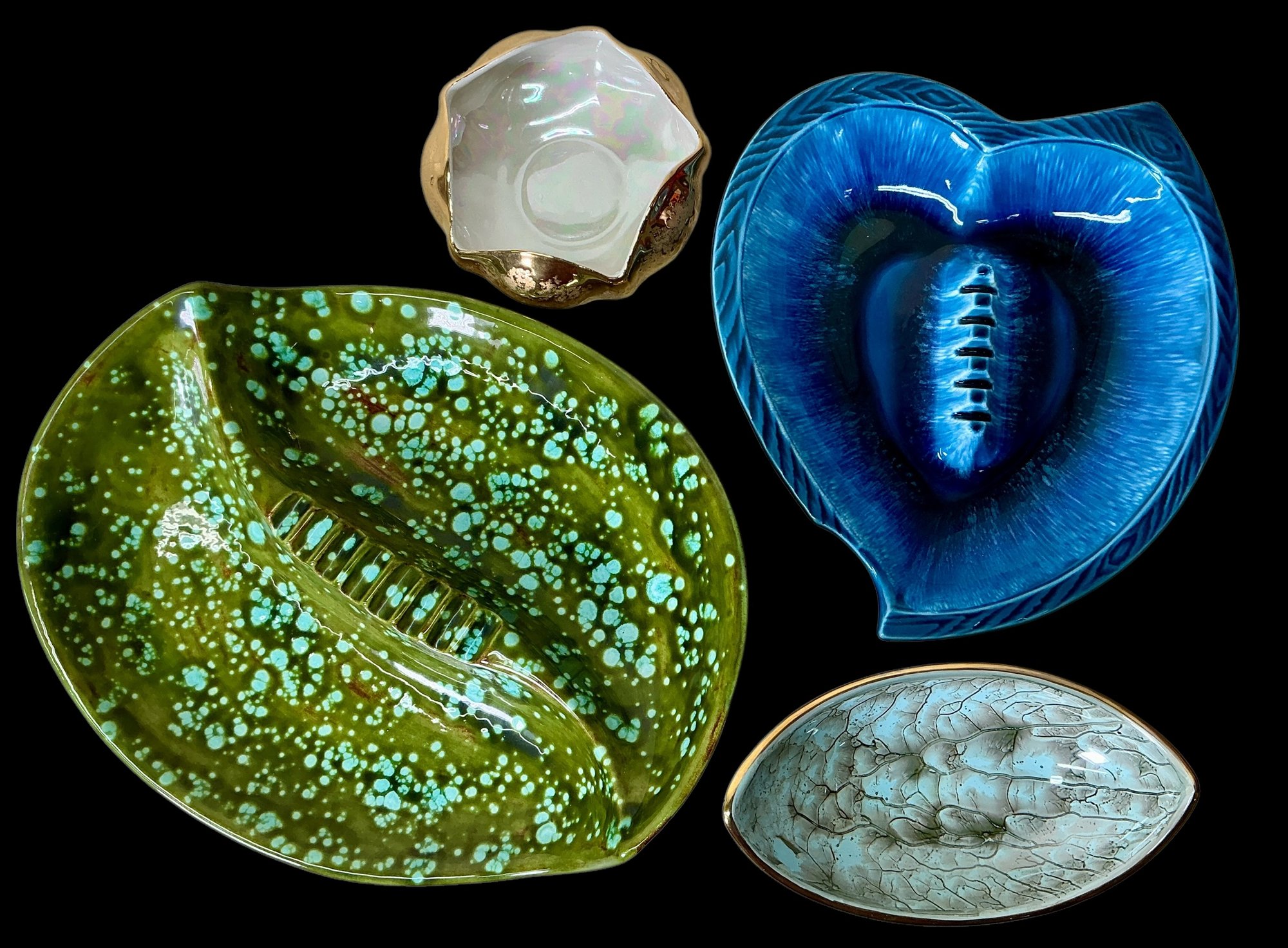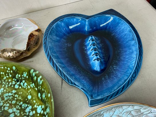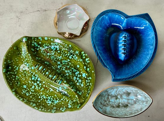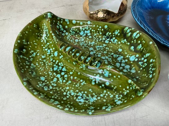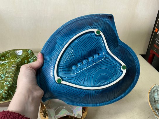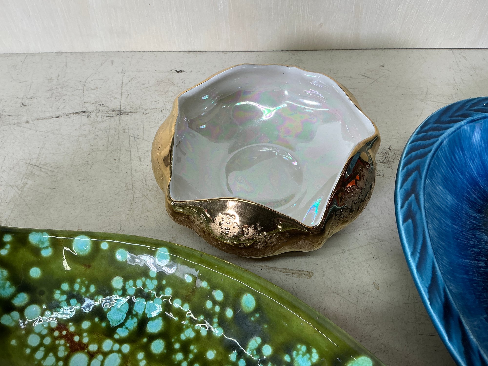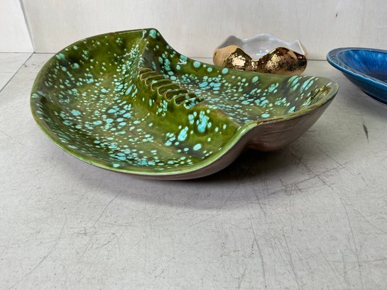 4 Pieces Of Mid-Century Modern Pottery. 2 Large ashtrays, a bowl, and Jewelry dish. The largest ashtray is approx. 12.5”x10.75”. Good condition, no chips. See photos for details.