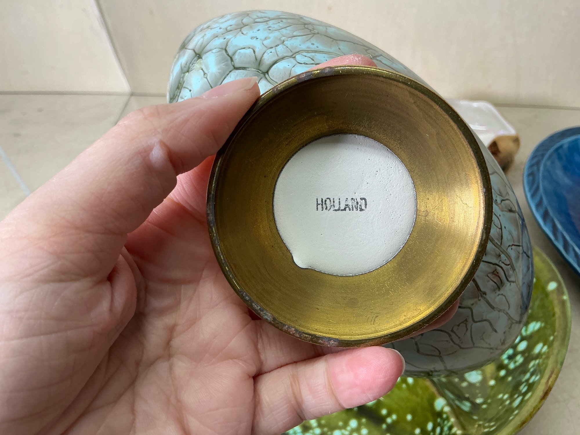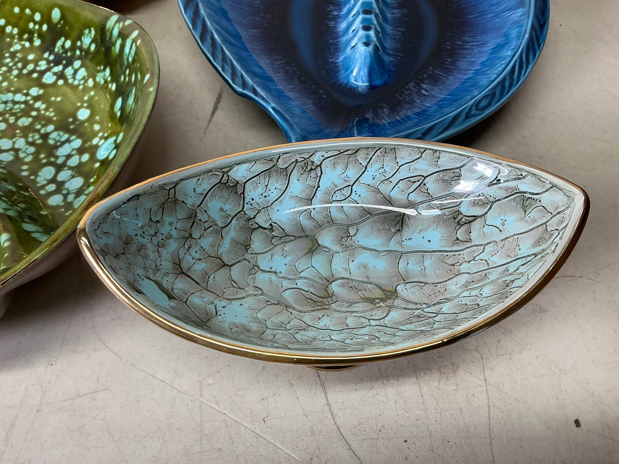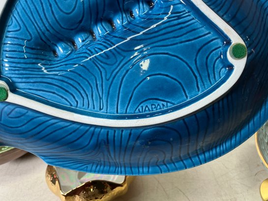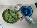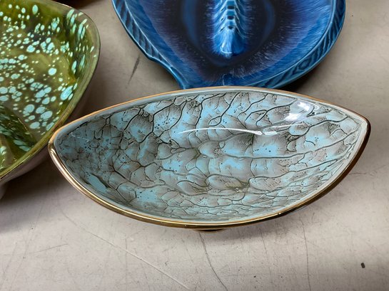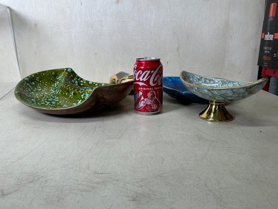 4 Pieces Of Mid-Century Modern Pottery. 2 Large ashtrays, a bowl, and Jewelry dish. The largest ashtray is approx. 12.5”x10.75”. Good condition, no chips. See photos for details.