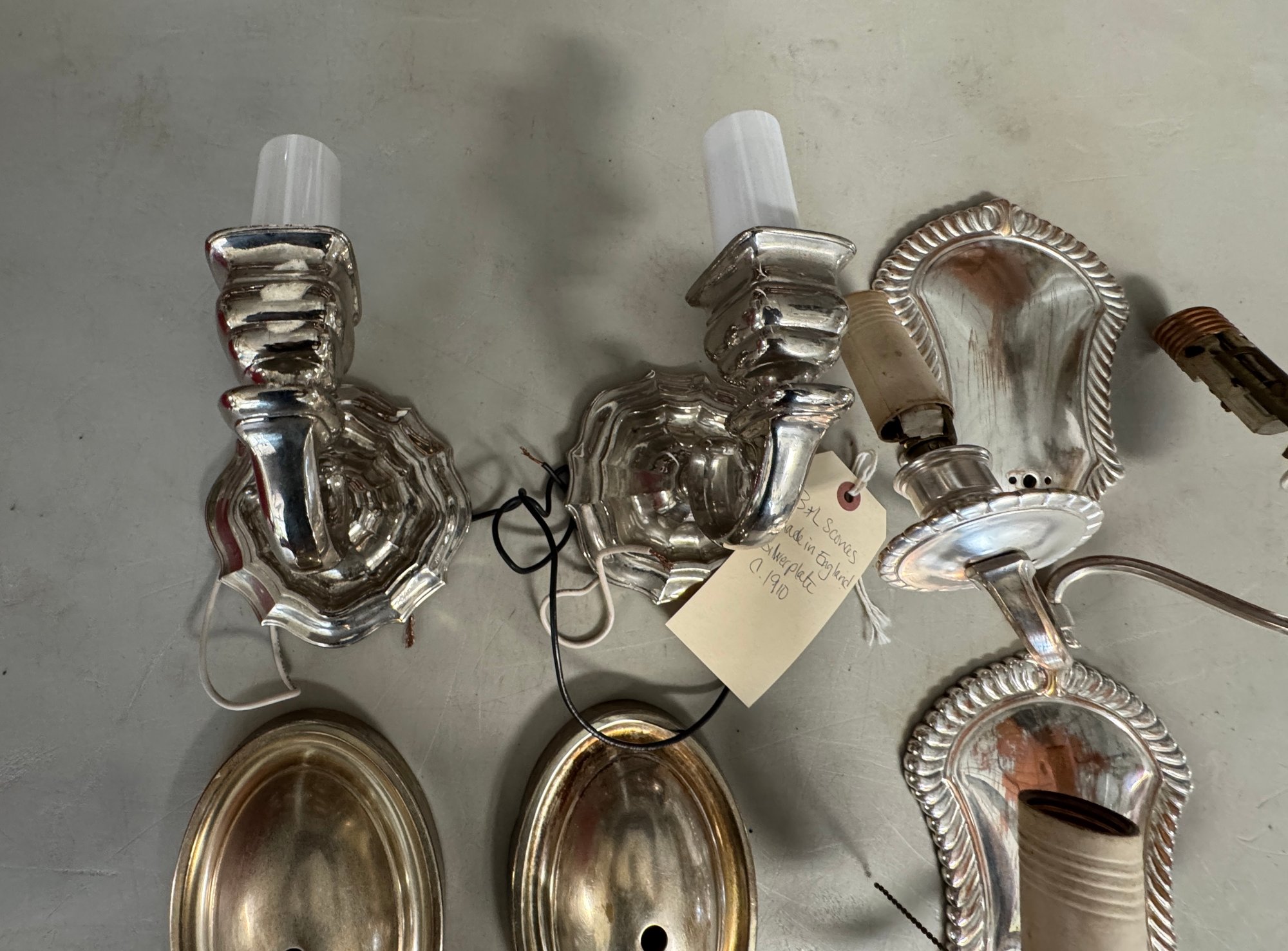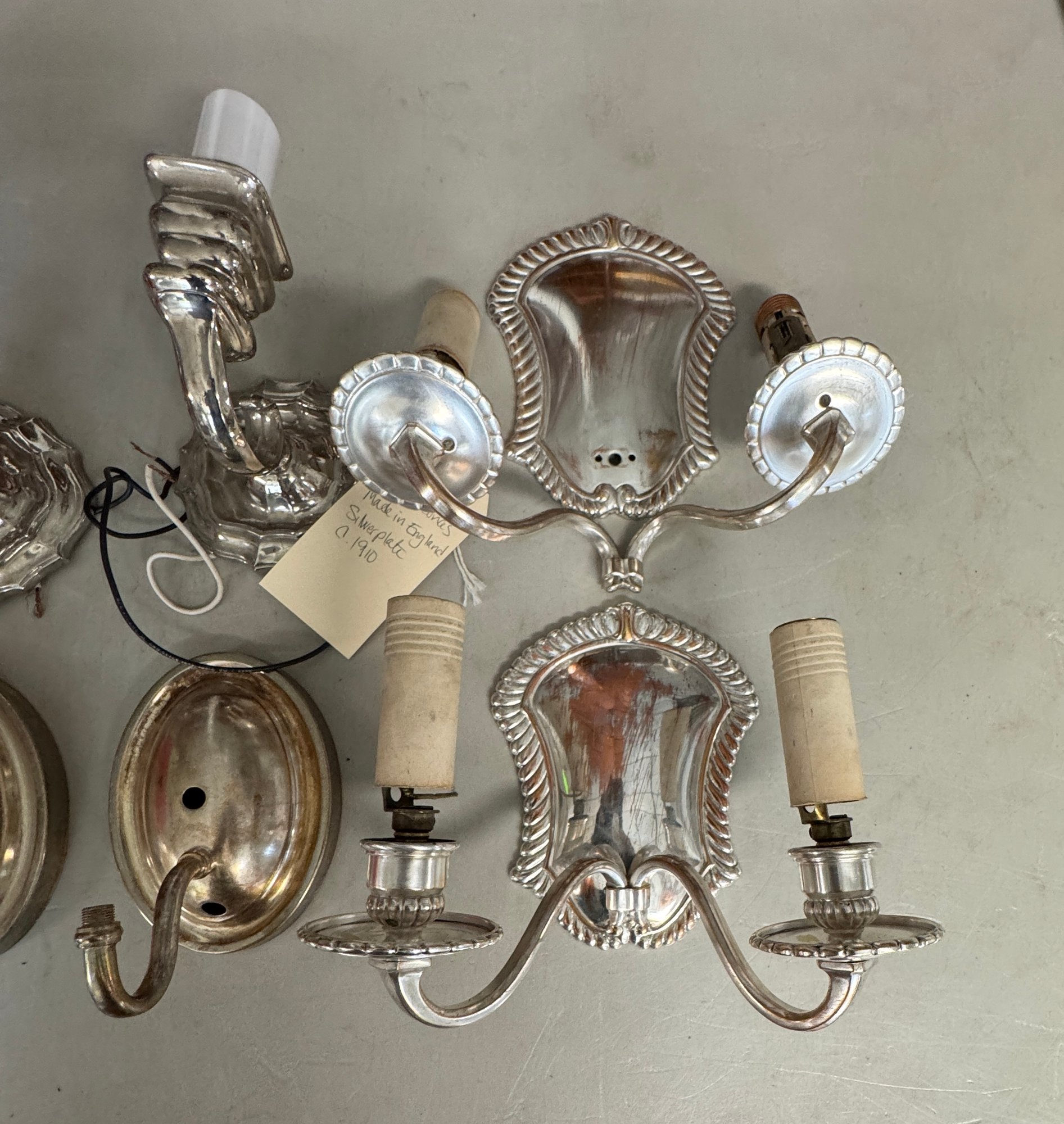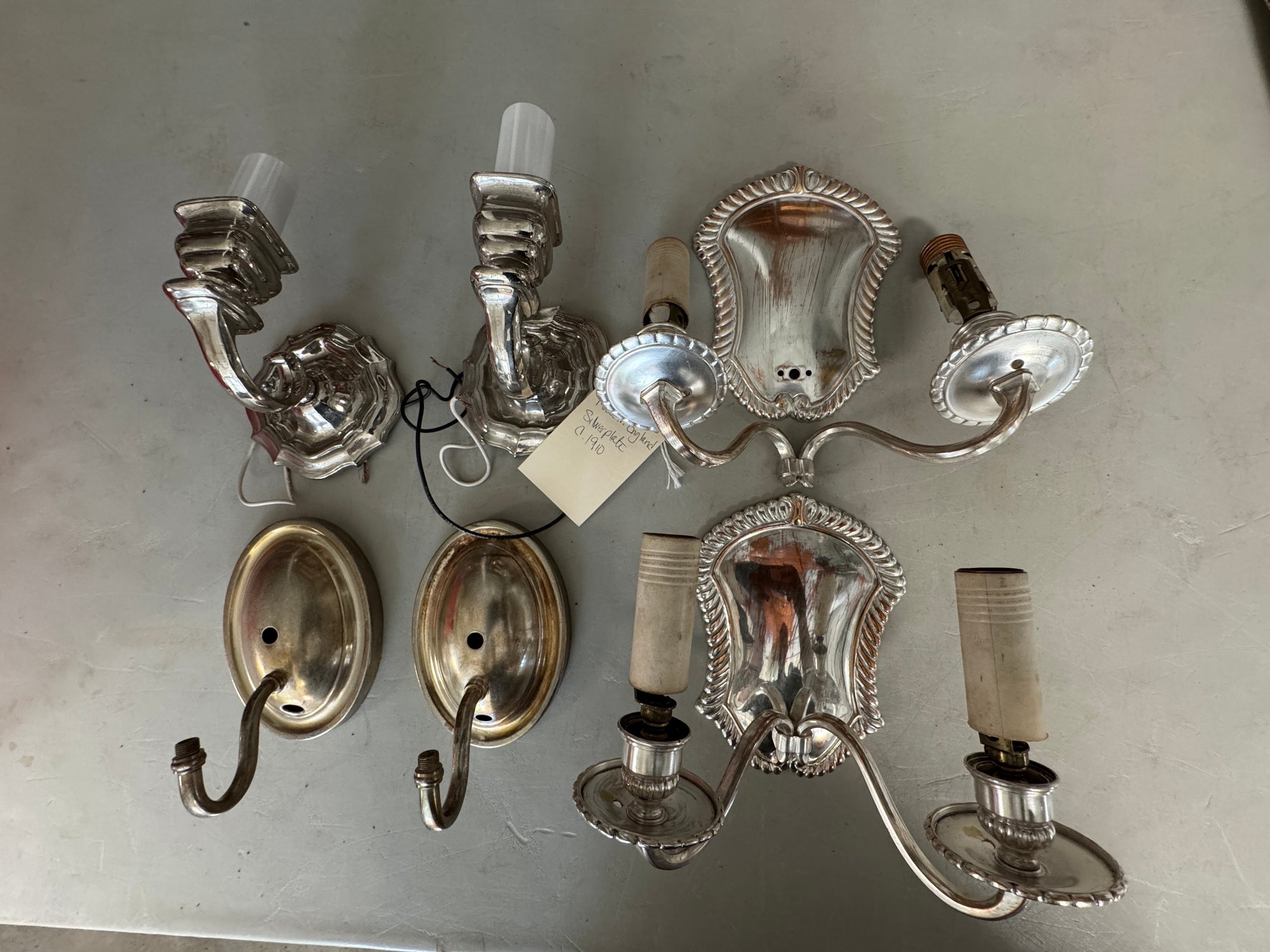 4 Silver Plate Sconces As Found - See photos for condition, and amount of completeness. The larger set measures 8" x 10" 7"