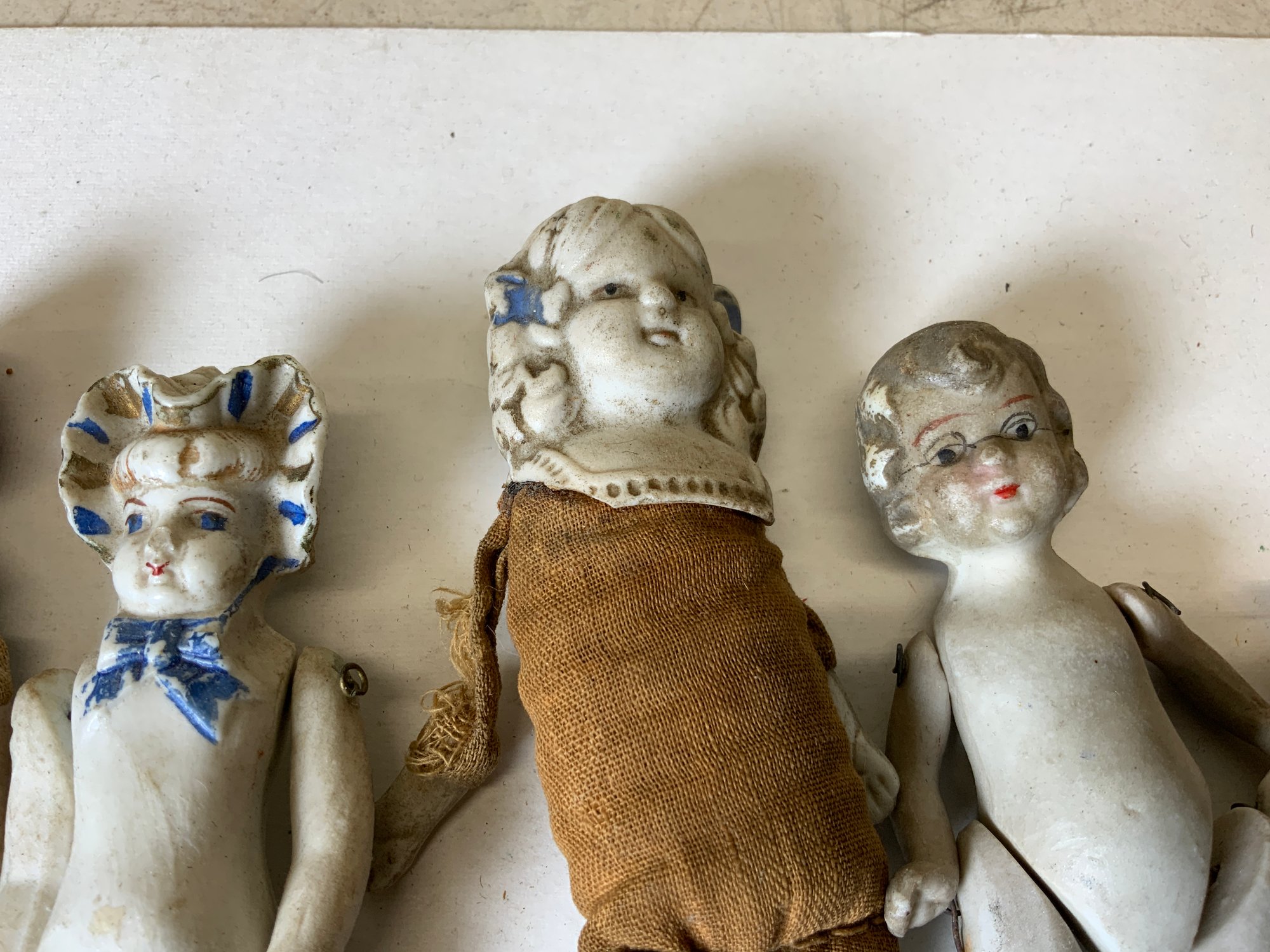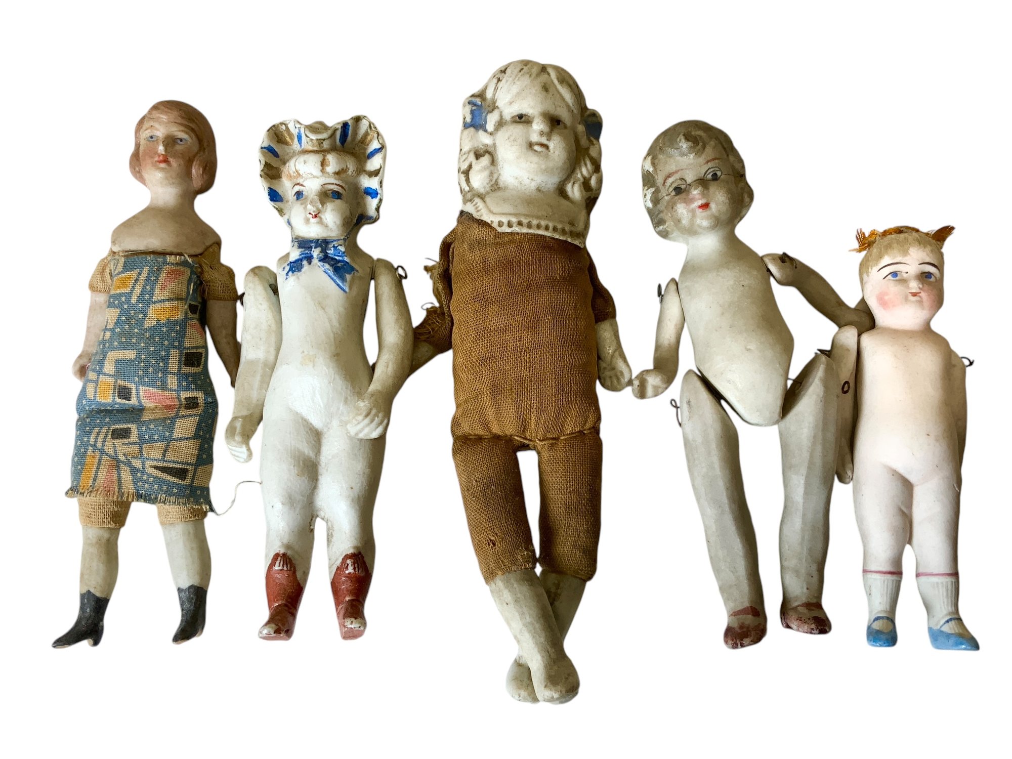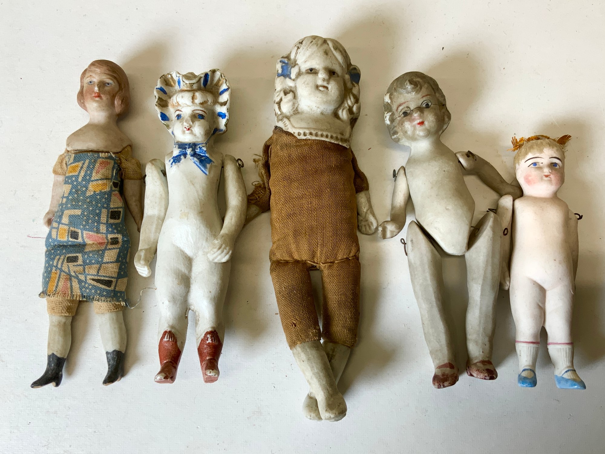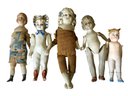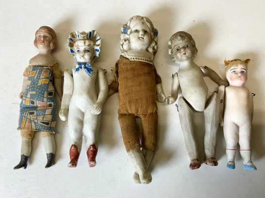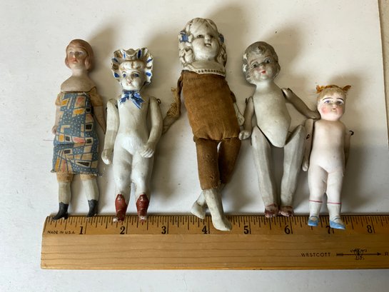 5 Antique Porcelain Bisque Dolls Various Eras, tallest is 5.5” see photos for condition, some minor damage.