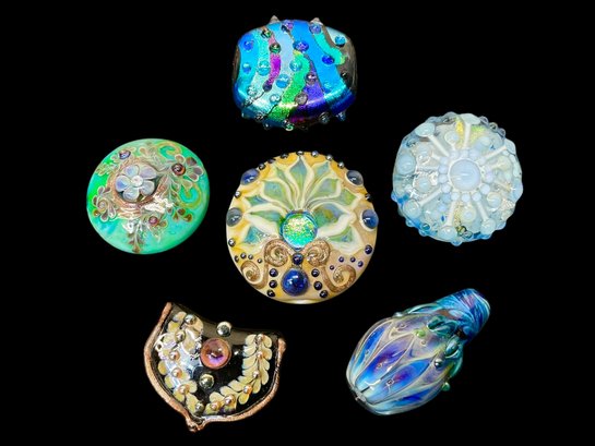 5 Large Center Piece Lamp Work Glass Beads Blown Glass, beautiful and very unusual designs. Largest measures approximately 1.5.”