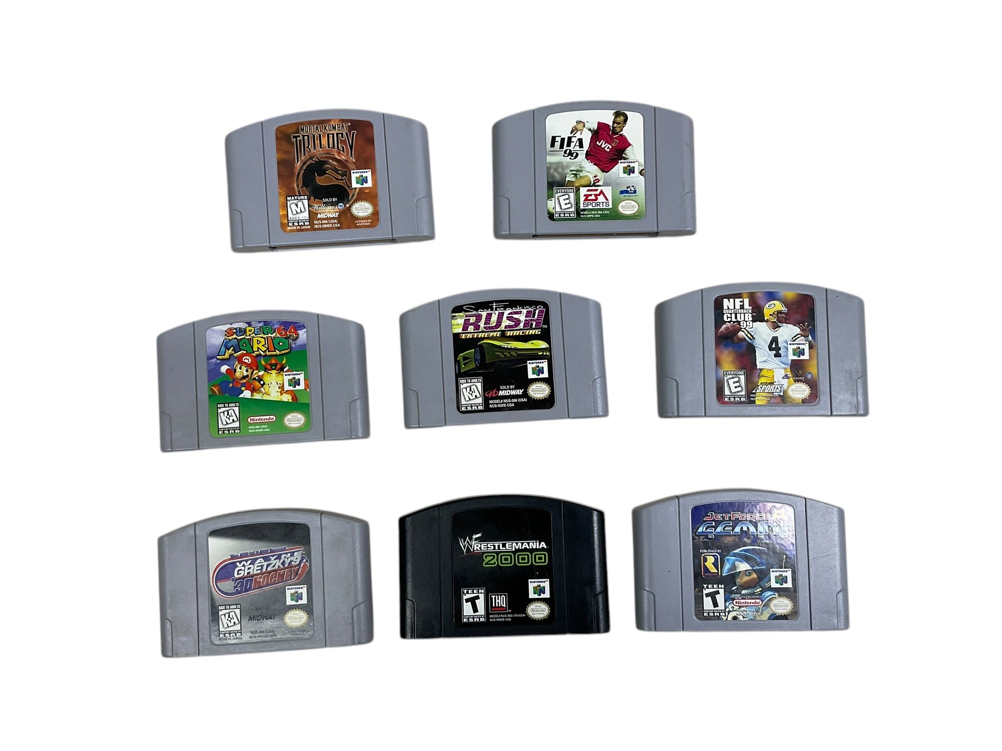 Lot of 8 Vintage Nintendo 64 Game Case And Games Jet Force Gemini Wrestlemania 2000 San Francisco Rush FIFA 99. All in good physical condition but the games are untested. The box is approx. 12” by 7” by 5”.