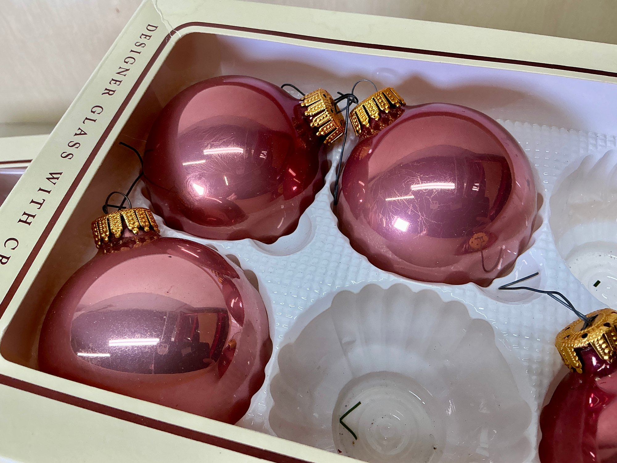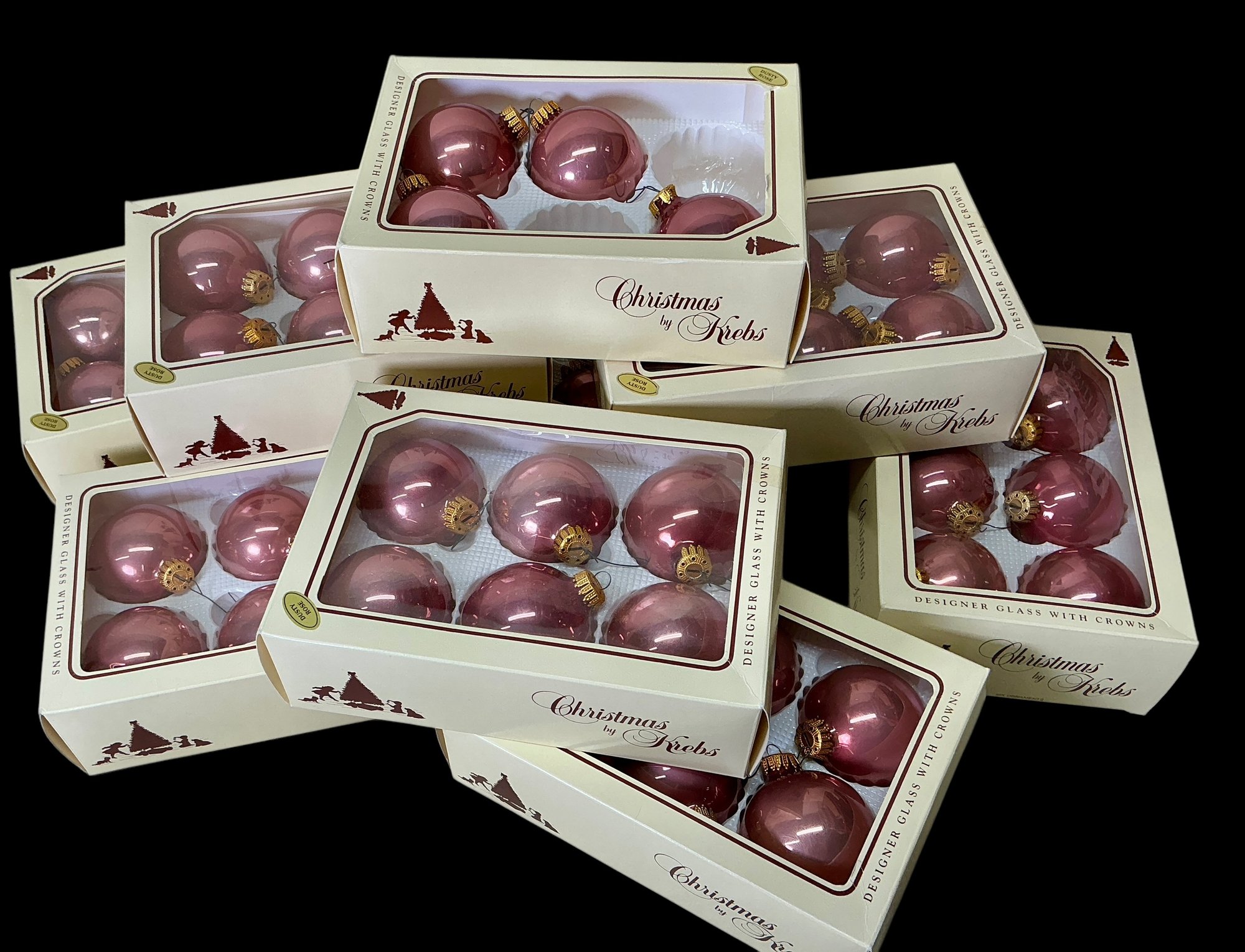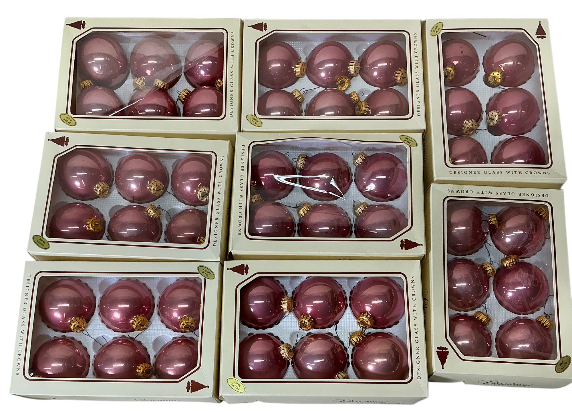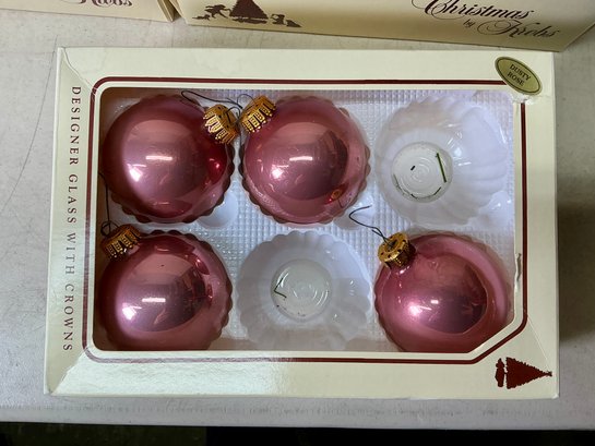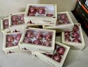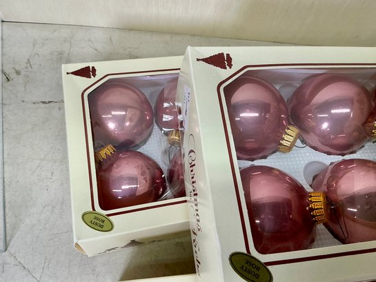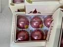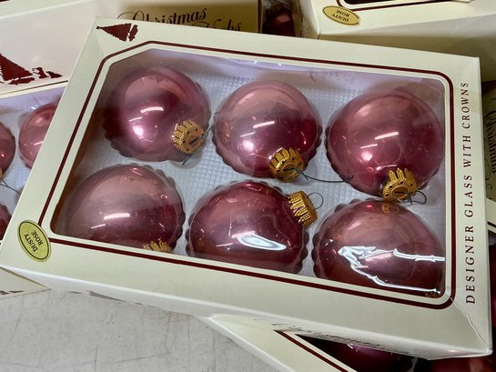 9 Boxes Of Vintage Dusty Rose Christmas By Krebs Glass Ornaments. 8 full boxes of six ornaments each, and 1 box of four ornaments. Glass ornaments are approx. 2.5” in diameter. See photos for details.