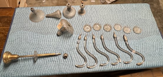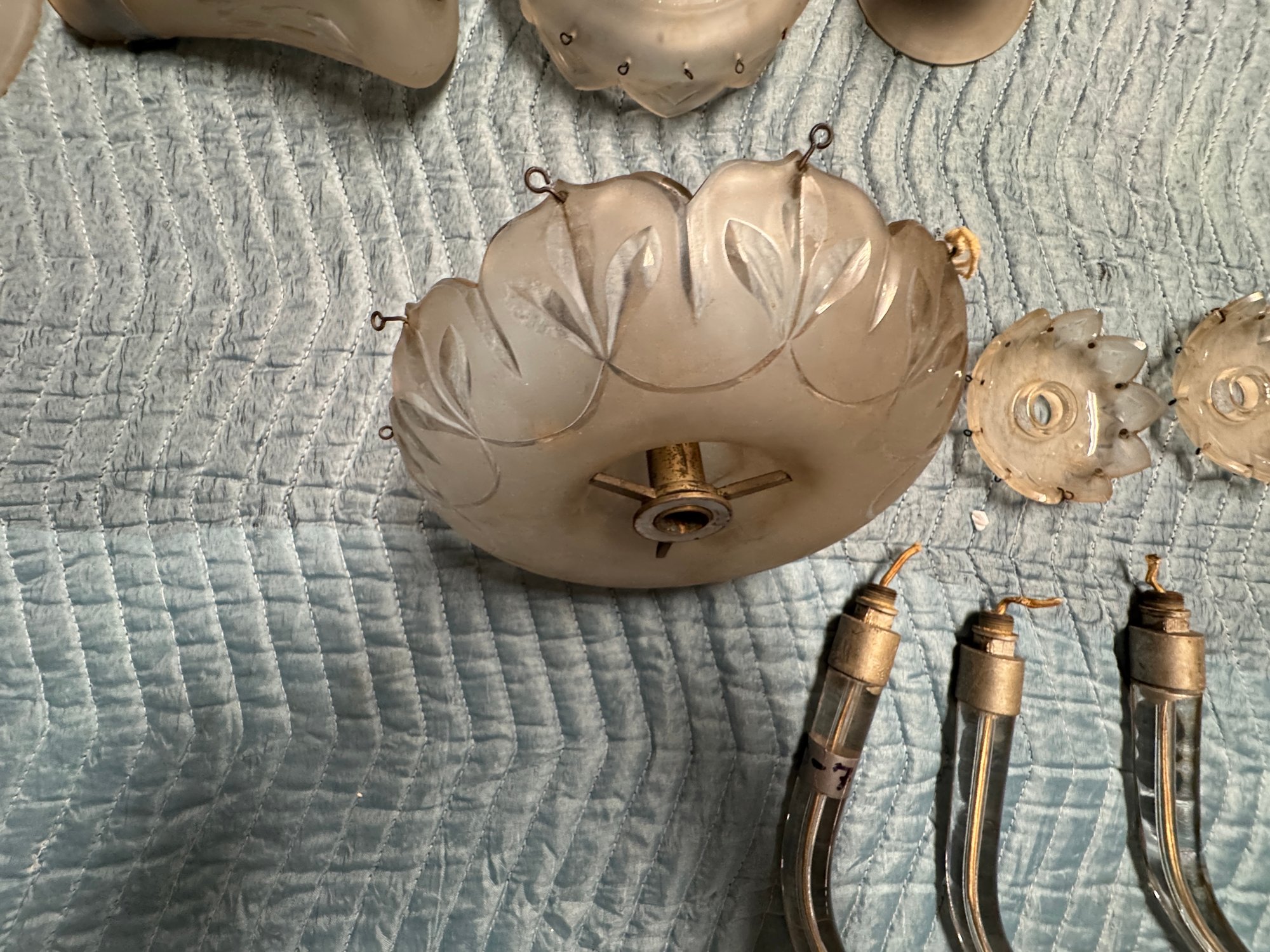 19th Century, frosted, cut crystal stem pieces. These fixtures are made of very fine crystal and have been sitting in these boxes for over 20 years! This was originally gas. You are buying these as they're found in the warehouse, please read the description closely. This measures approximately 48" tall x 38". Since we've not assembled these, the measurements are rough estimates.