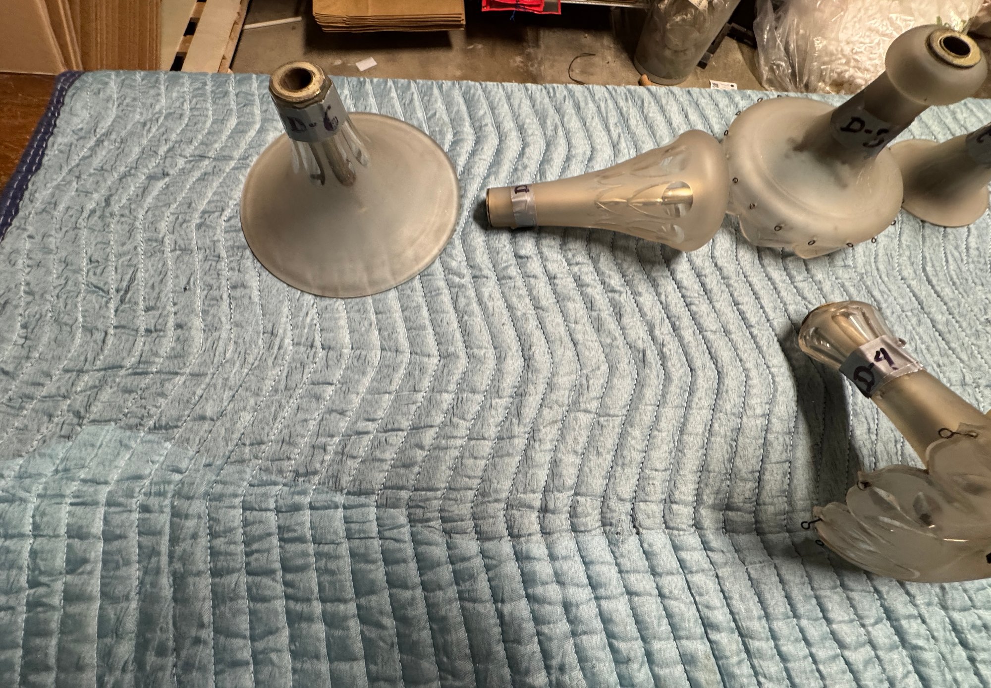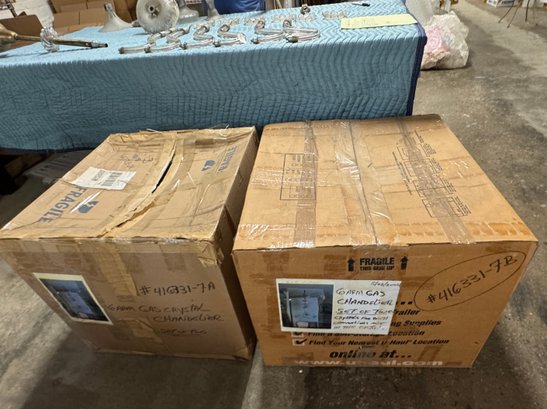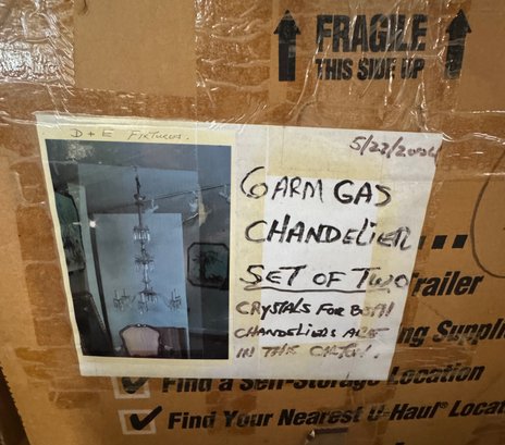 Shown are the parts from box 1 of 2. Box 2 has not been unpacked, but the label says it contains the prisms for both chandeliers.