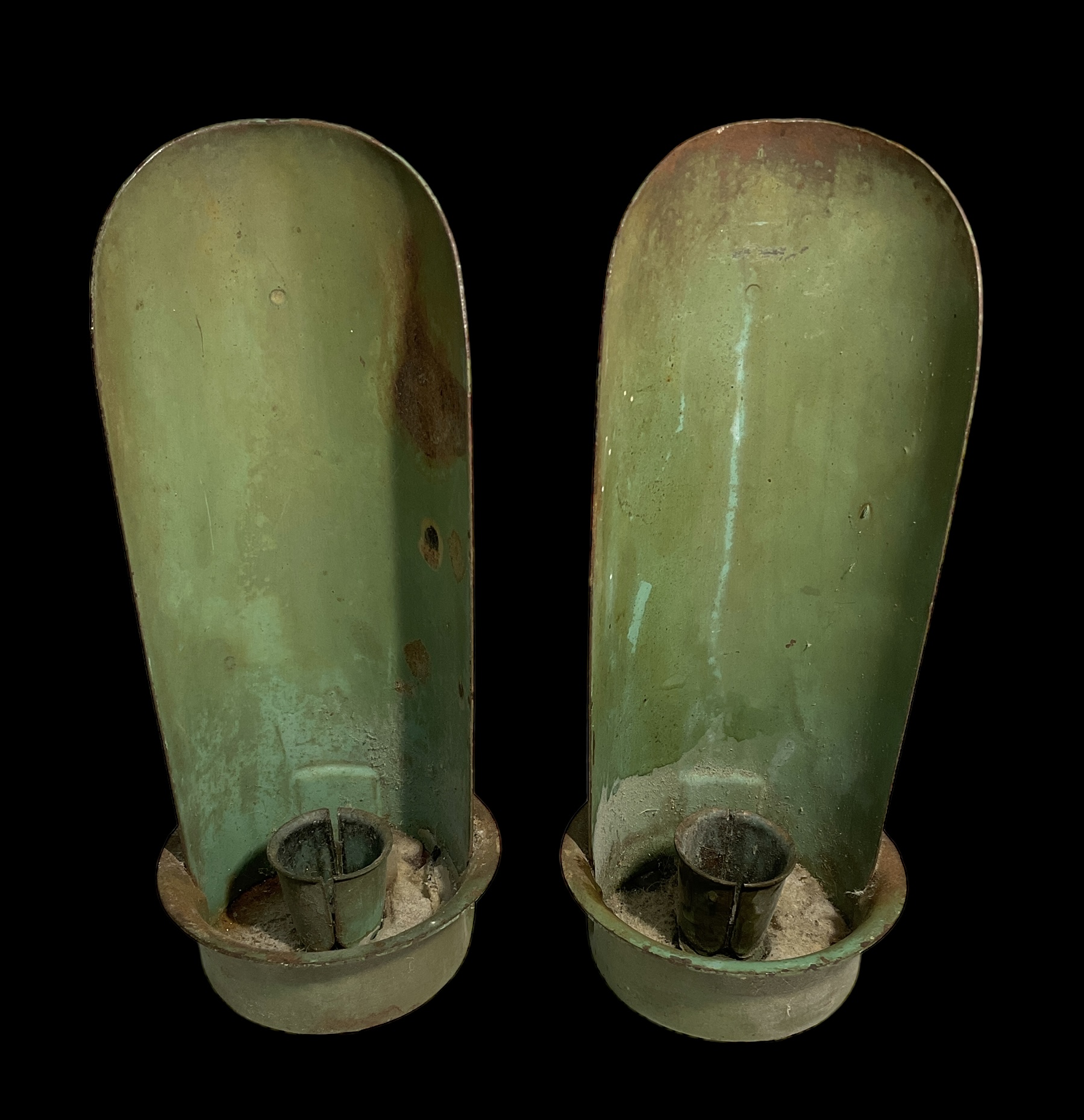 Pair Of Antique Painted Metal Candleholders. 6.75” tall. Can be carried or affixed to the wall.