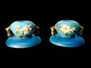 Pair Of Roseville Pottery Apple Blossom Bud Vases, very very slight crazing to the surface, an abnormality on the inside underneath rim on one, seems to be in the making. 2.25” tall.