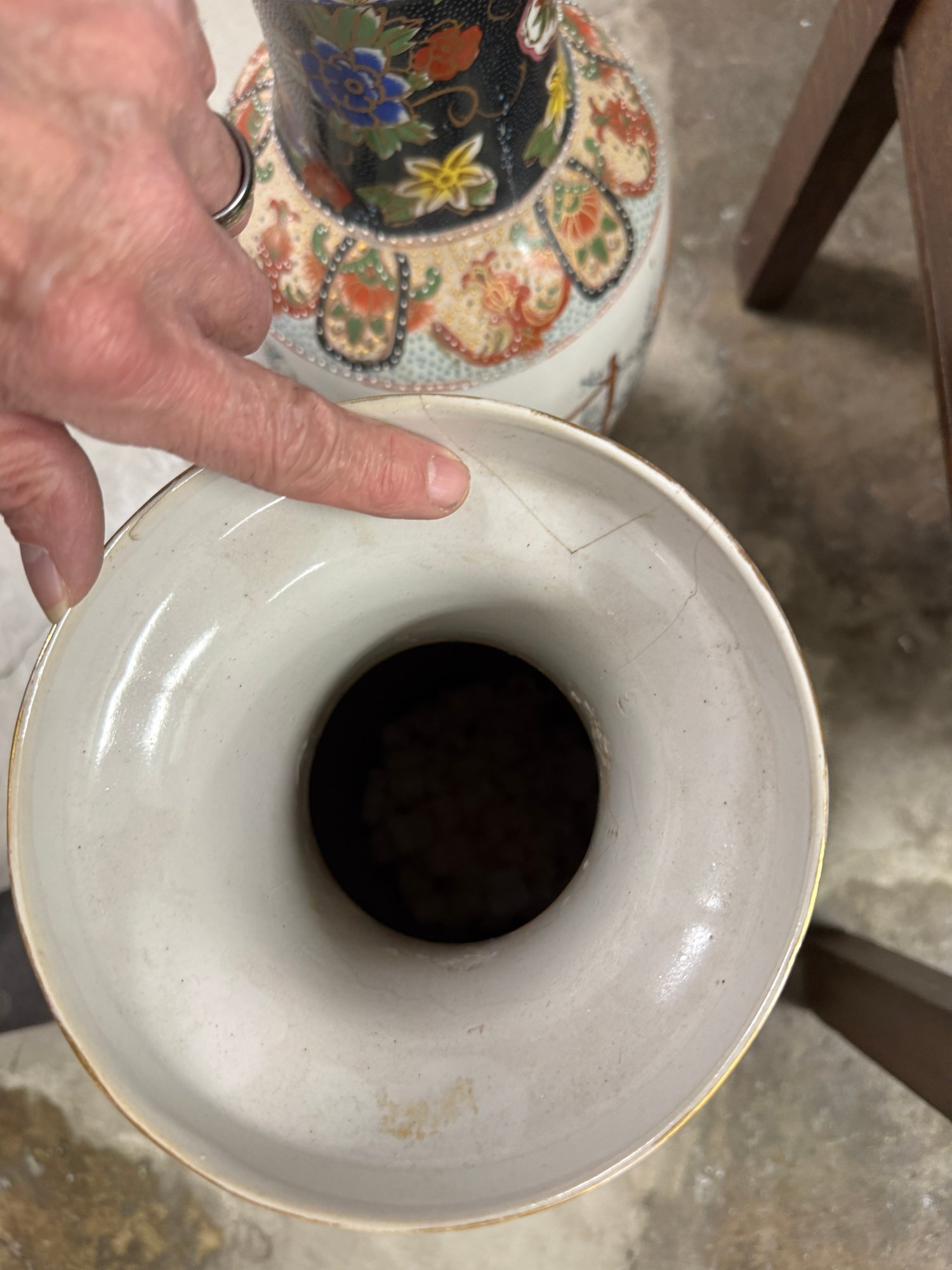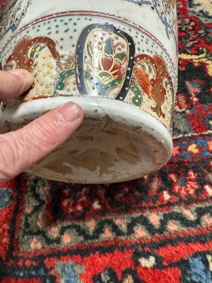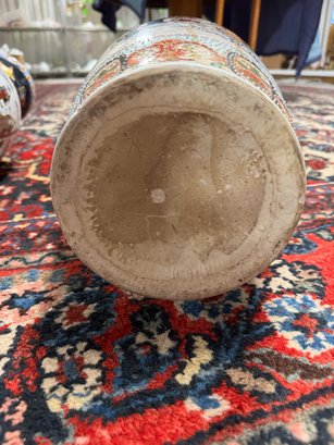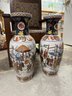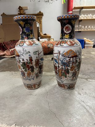 Pair of Satsuma Floor Vases - One has a hairline crack on top and a bit of damage on the base, the other is fine. See photos. 23.5" tall x 8" diam.