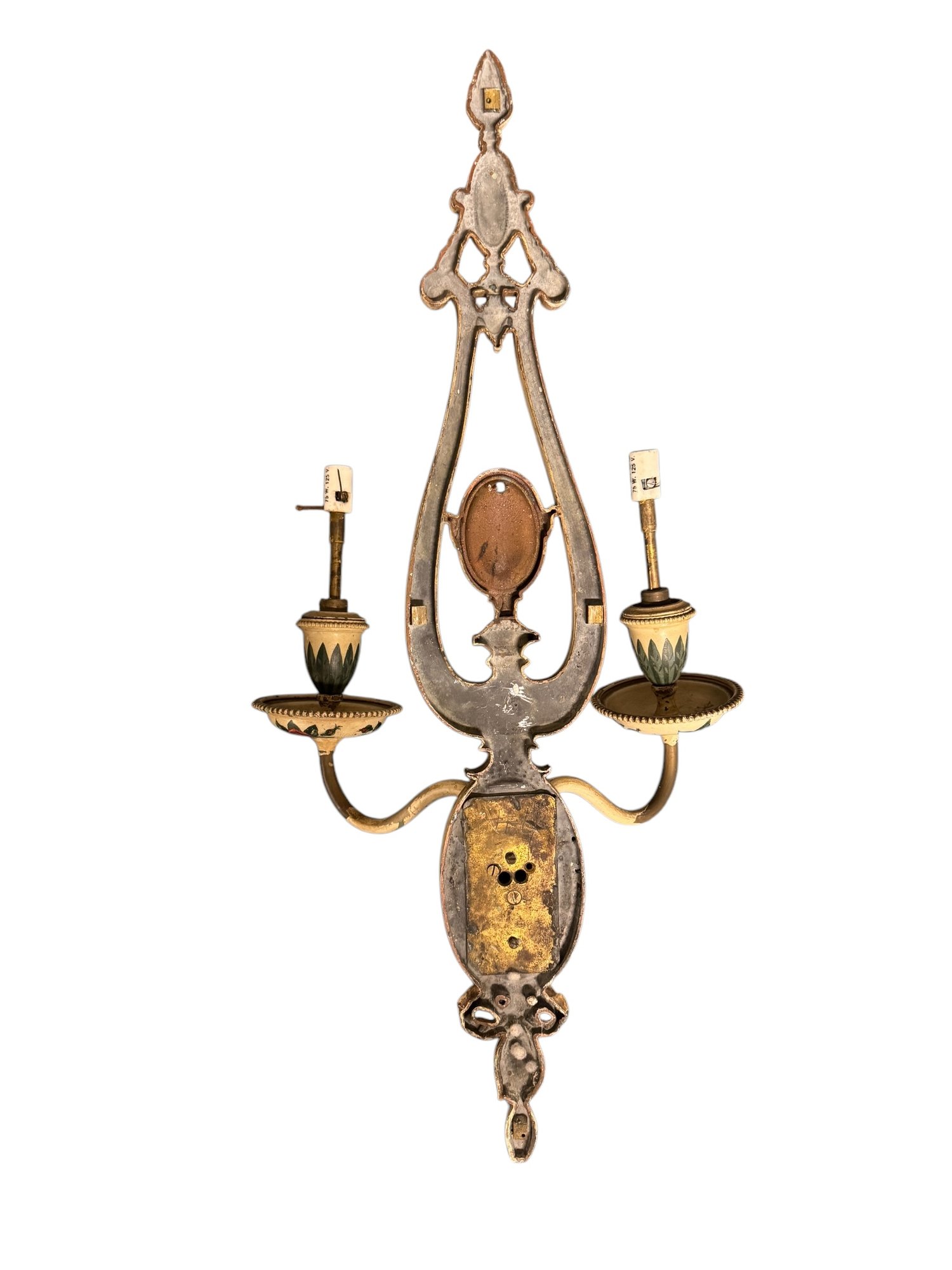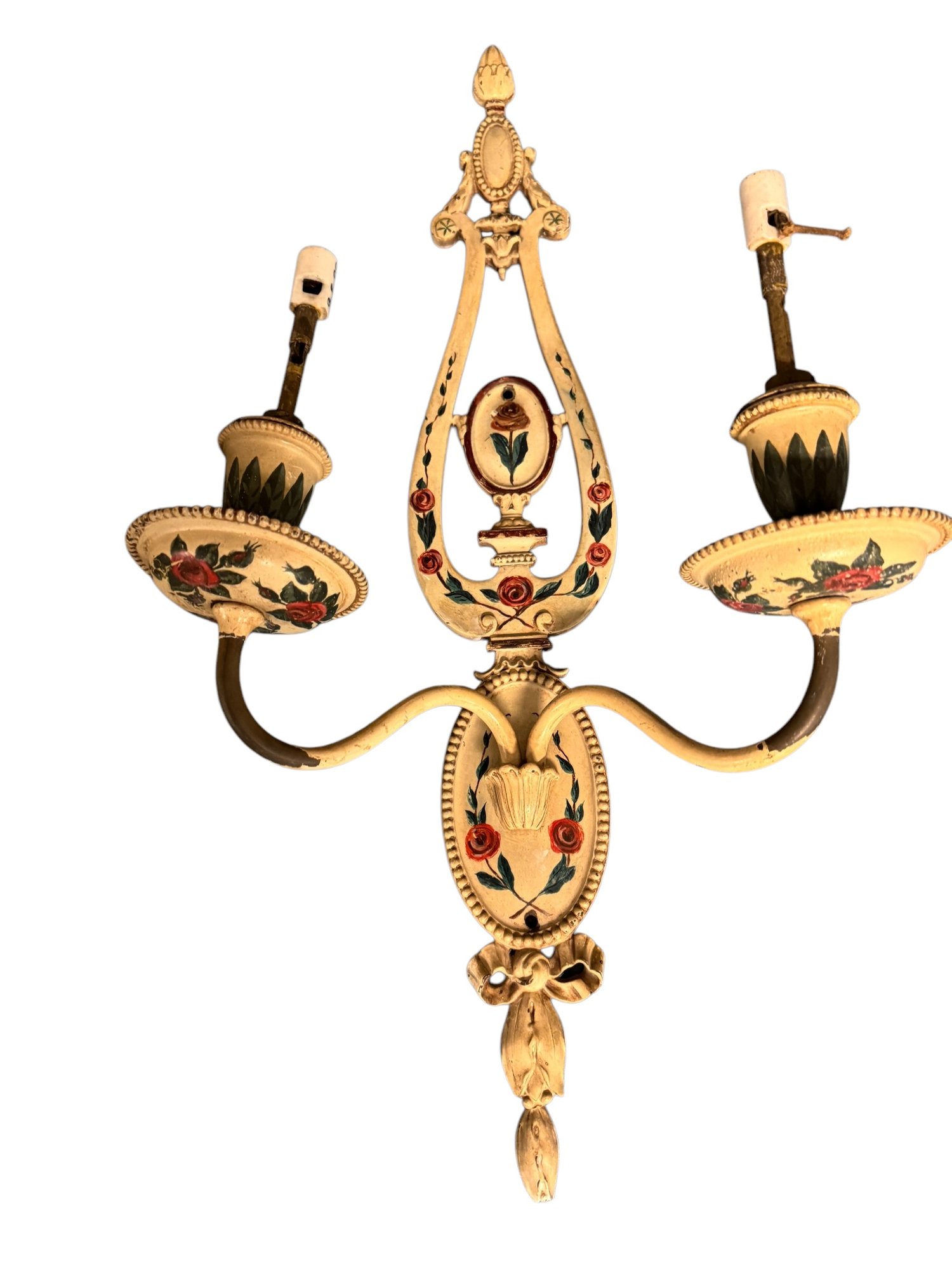 Pair of E F Caldwell Sconces With Tole painting. One of the arm brackets has come unscrewed, but is not broken and can be reattached. Signed on sockets.