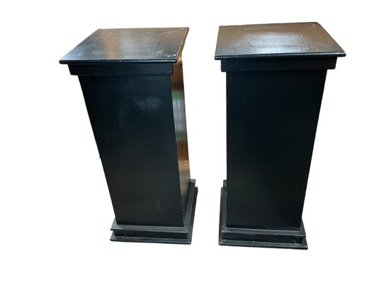 Pair Of Vintage Black Painted Wooden Display Plinths. In good used condition with some minor wear and scratches, please see photos. They are each approx. 16.5” square and 37.5” tall.