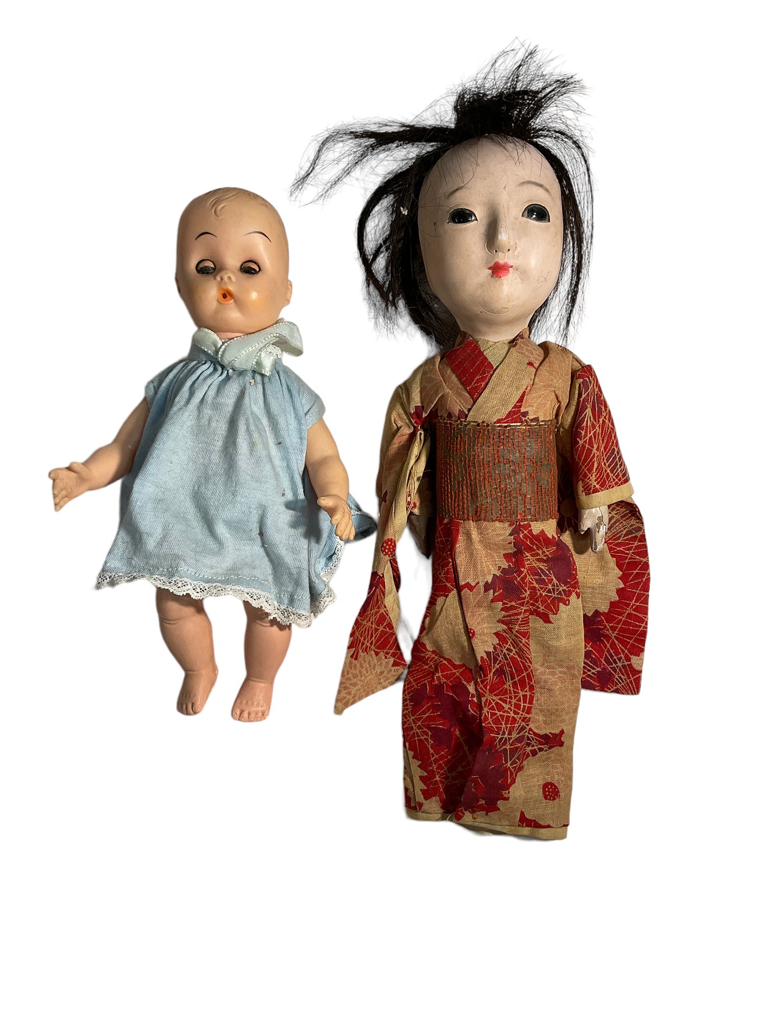 Pair of Vintage Dolls. Composition and plastic? Has some wear, see pictures. Approx. 8.5” and 9”.
