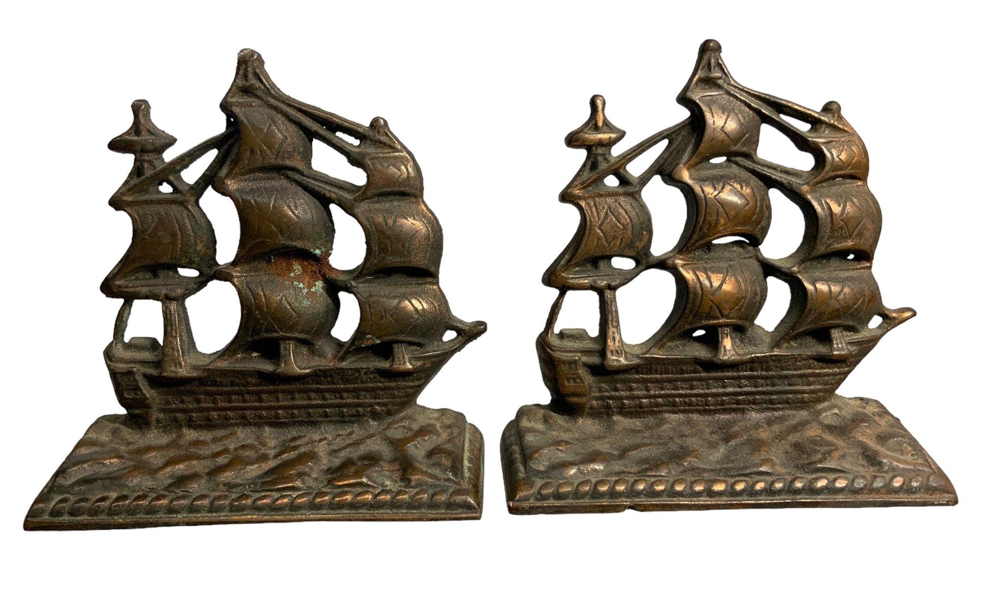 Pair Of Vintage Iron US Constitution Ship Bookends. In fair used condition, one bookend has a spot of corrosion, please see photos. They are approx. 5” tall and 5.5” wide.