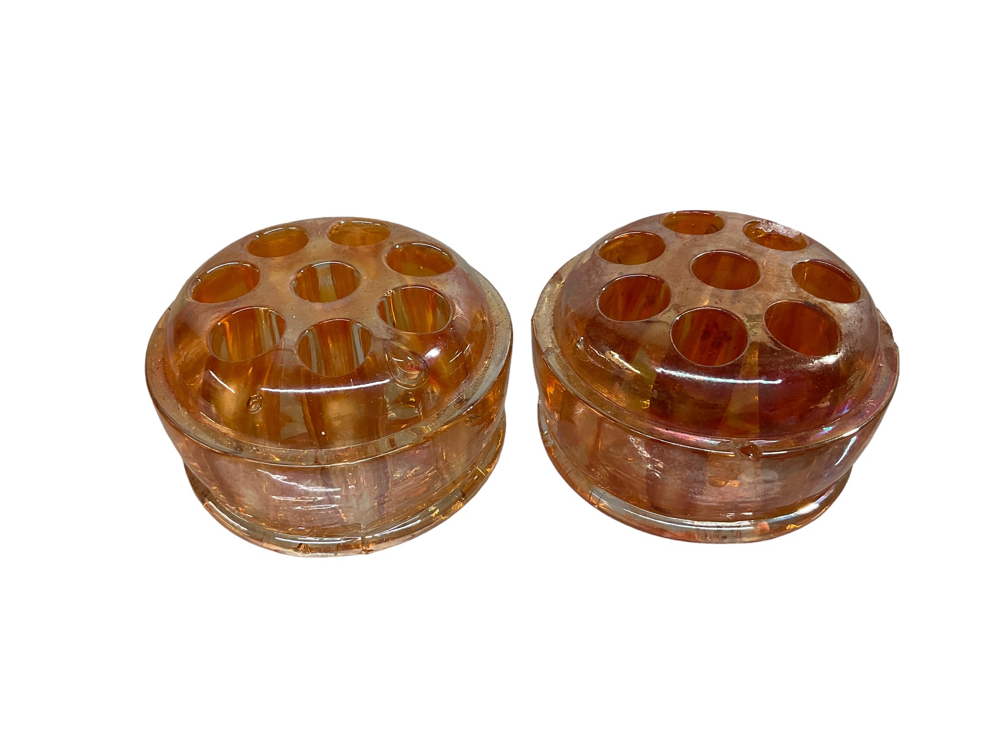 Pair Of Vintage Orange Carnival Glass Flower Frogs. One frog has two chips, see pictures. Approximately 2.5” diameter. Baseball is there for scale, not included in lot.