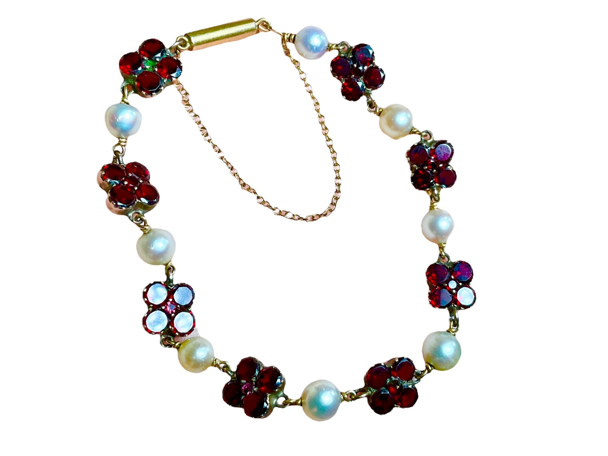 Antique 14K Red Stone And Authentic Pearl Bracelet, this appears to have a more modern clasp fixed to a much older portion of bracelet set with red stones, possibly garnets or rubies. Stone settings are also guaranteed to be 14K or higher. Bracelet length is just shy of 7.”