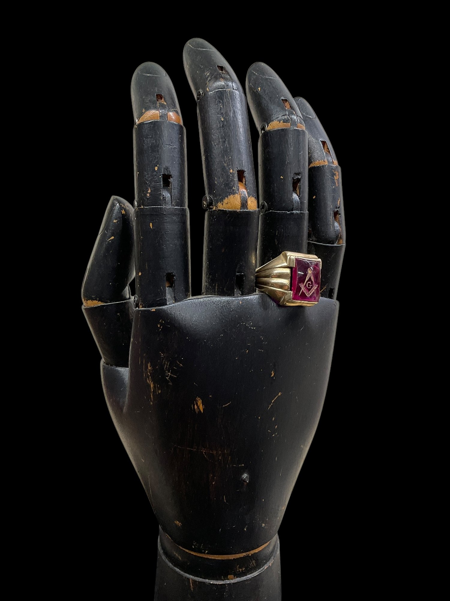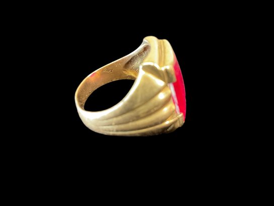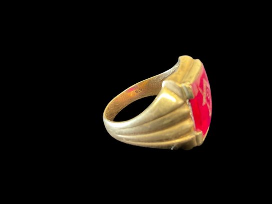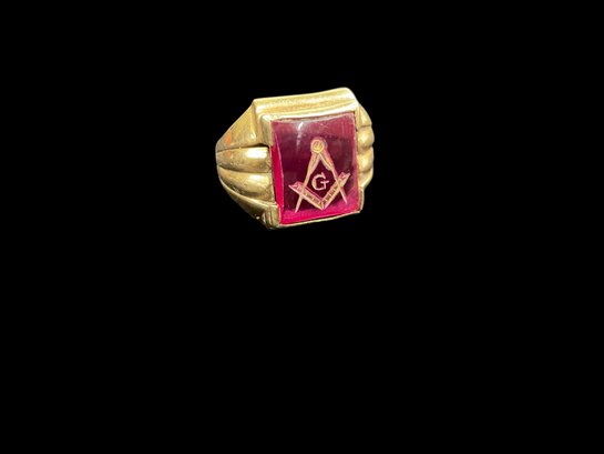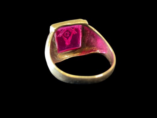 Antique 14K Yellow Gold Masonic Ring With Possible Ruby 5.85 DWT. Marked 14K twice on band. In good used condition with light wear to ring and stone. We are not sure what the stone is, there are no air bubbles to indicate it is glass. Ring is approx. size 10. It weighs 5.85 DWT.