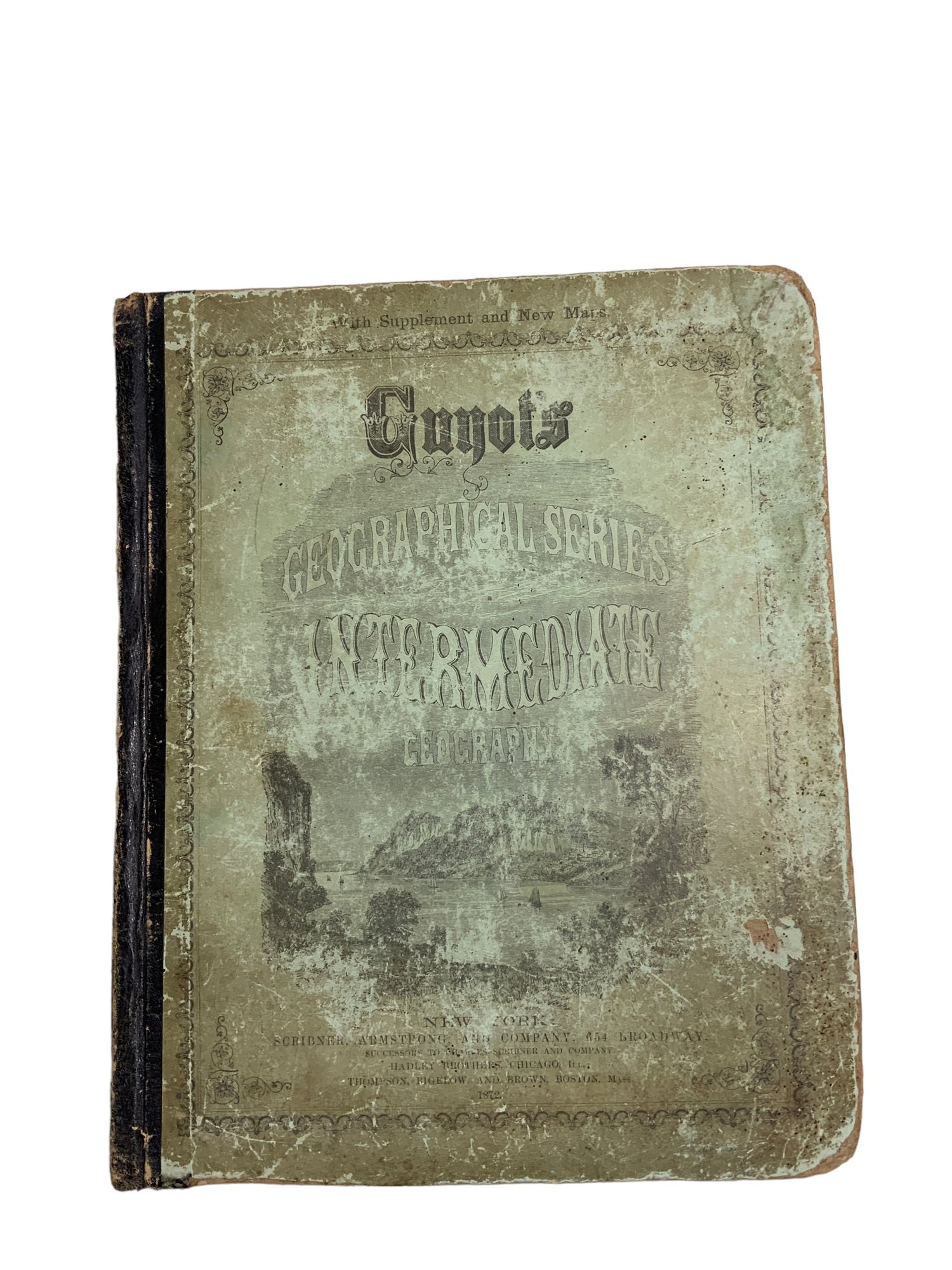 Antique 1872 Guyots Geography Book With Maps Showing Indian Territory America. In poor condition with loose pages and many edge tears, please see photos. It is approx. 12.5” by 10”.