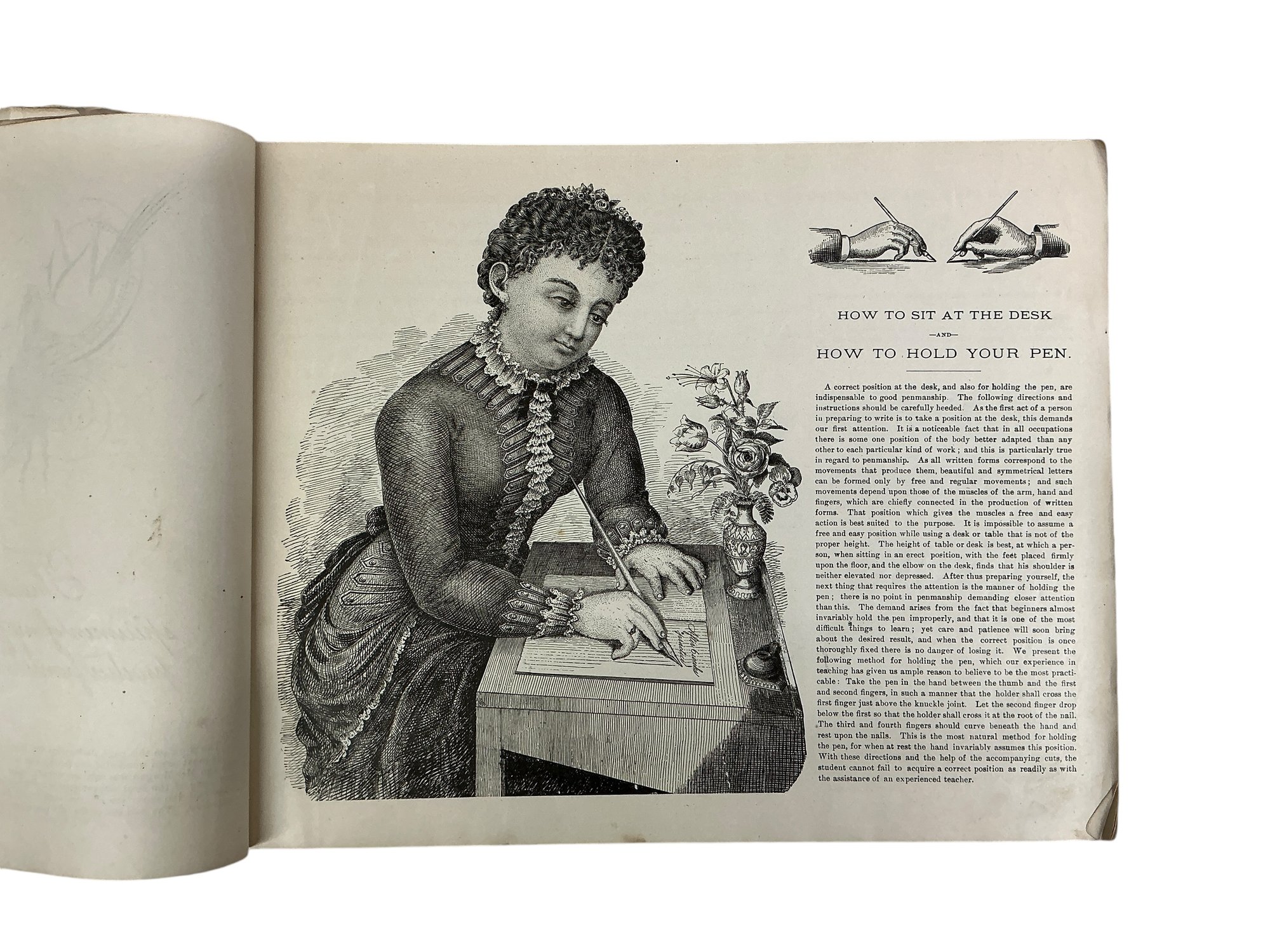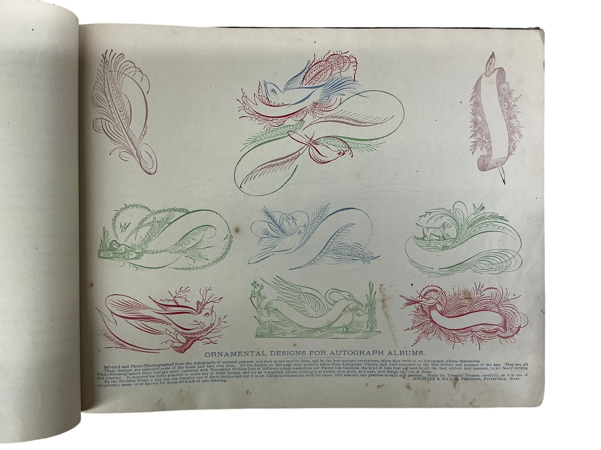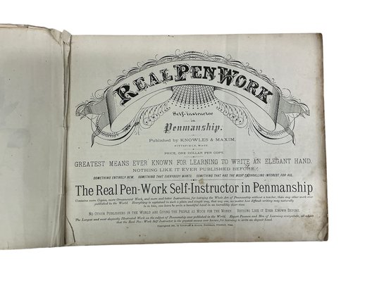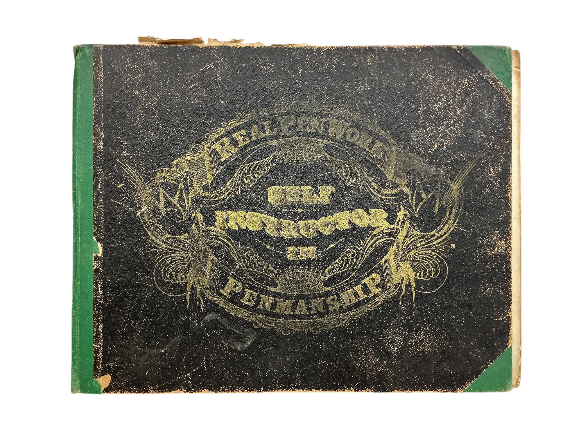 Antique 1881 Book On Real Pen Work Penmanship. Some creased pages and a tape repair at the front fly leaf, see photos. It is approx. 11.5” by 9.”