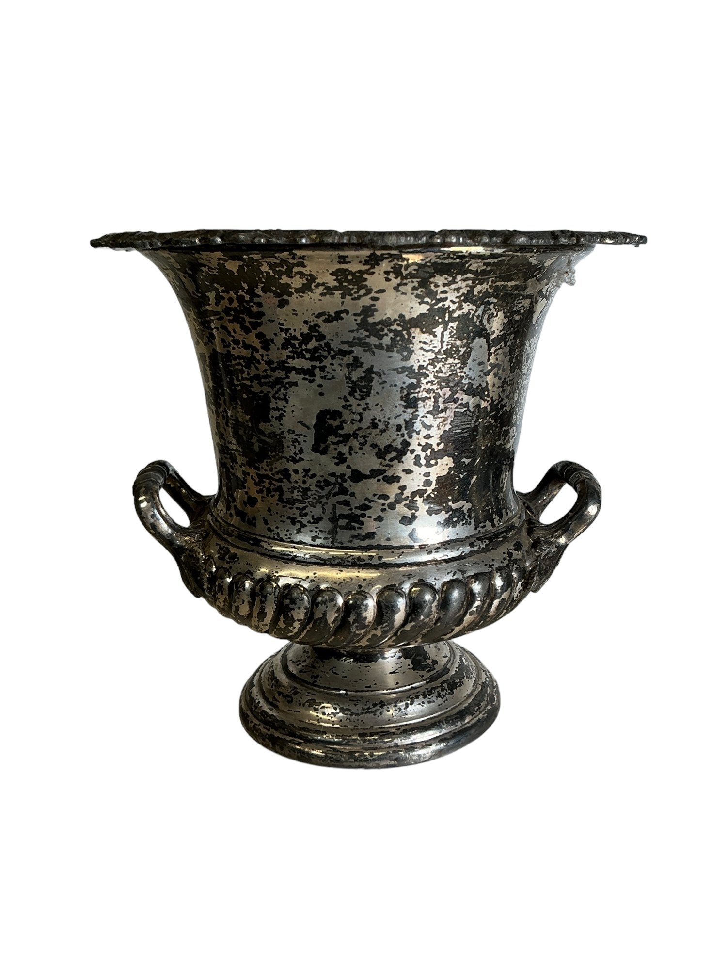 Antique Silver Plate Urn Great As A Flower Pot Or For The Garden. In good used condition with all over staining and a slightly crooked rim. It is approx. 9.75” tall.