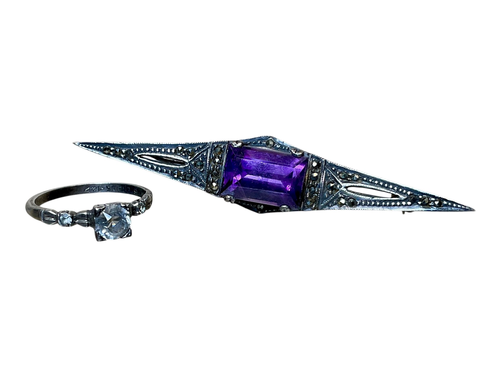 Antique Edwardian Or Style Pin And Sterling Engagement Style Ring, pin is authentic amethyst with natural inclusions and Marcasite with no missing stones. Ring is a size 7 with stone untested. Both marked and guaranteed sterling. Pin measures 2.5” wide.