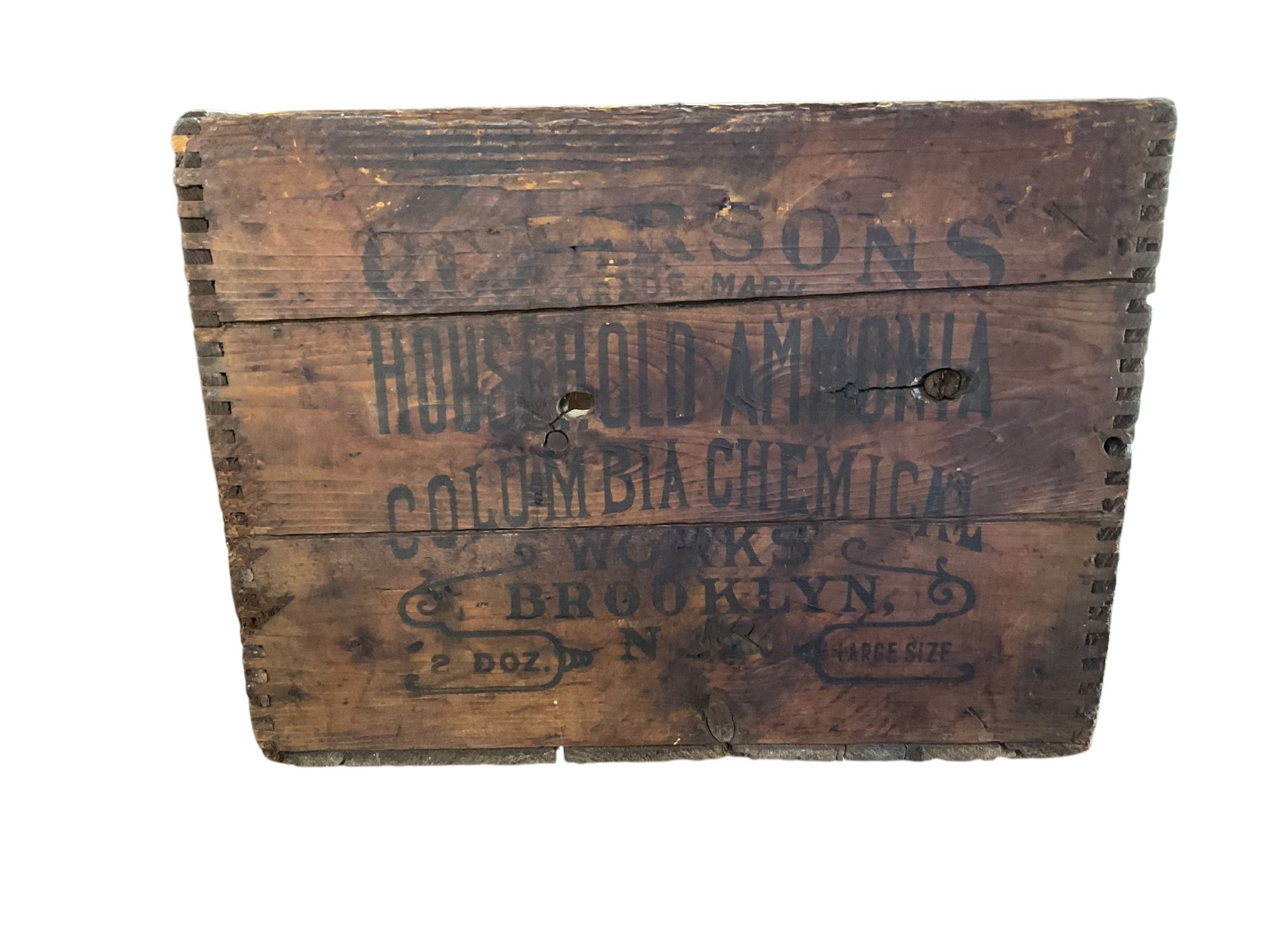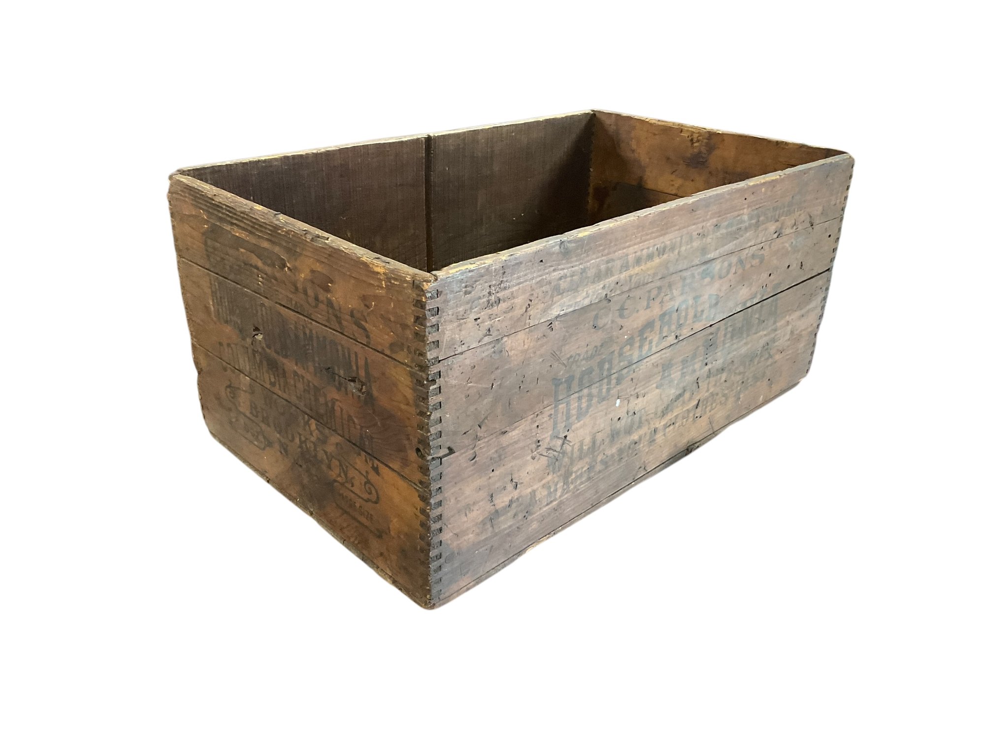 Antique Advertising Crate Parsons Household Ammonia. In good used condition with some wear. It is approx. 11.5” by 15.5” by 25.5”.