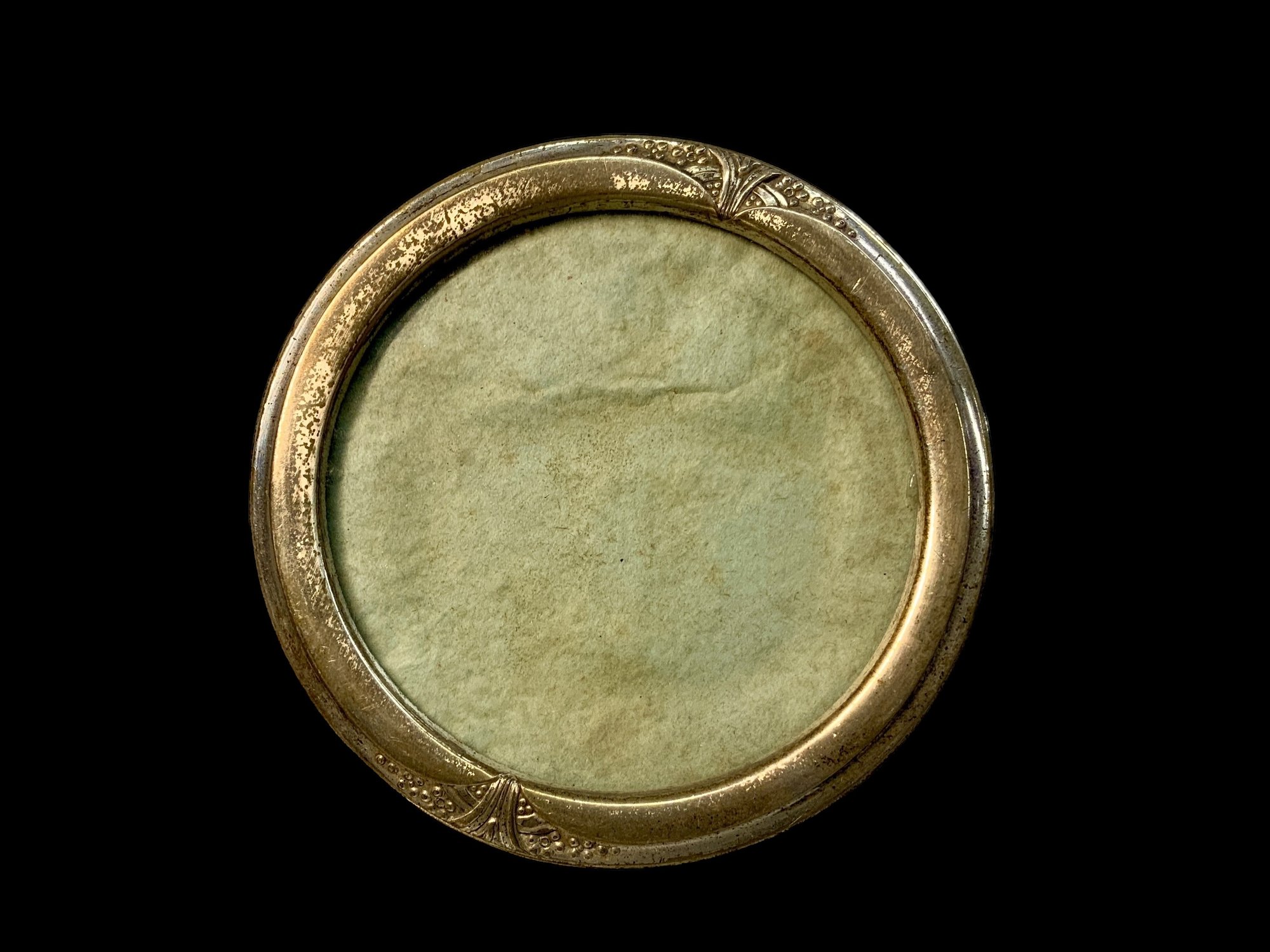 Antique Art Deco Sterling Silver Circle Picture Frame, measures 3.5” across. Engraved, “Elaine Giblin” and marked sterling.