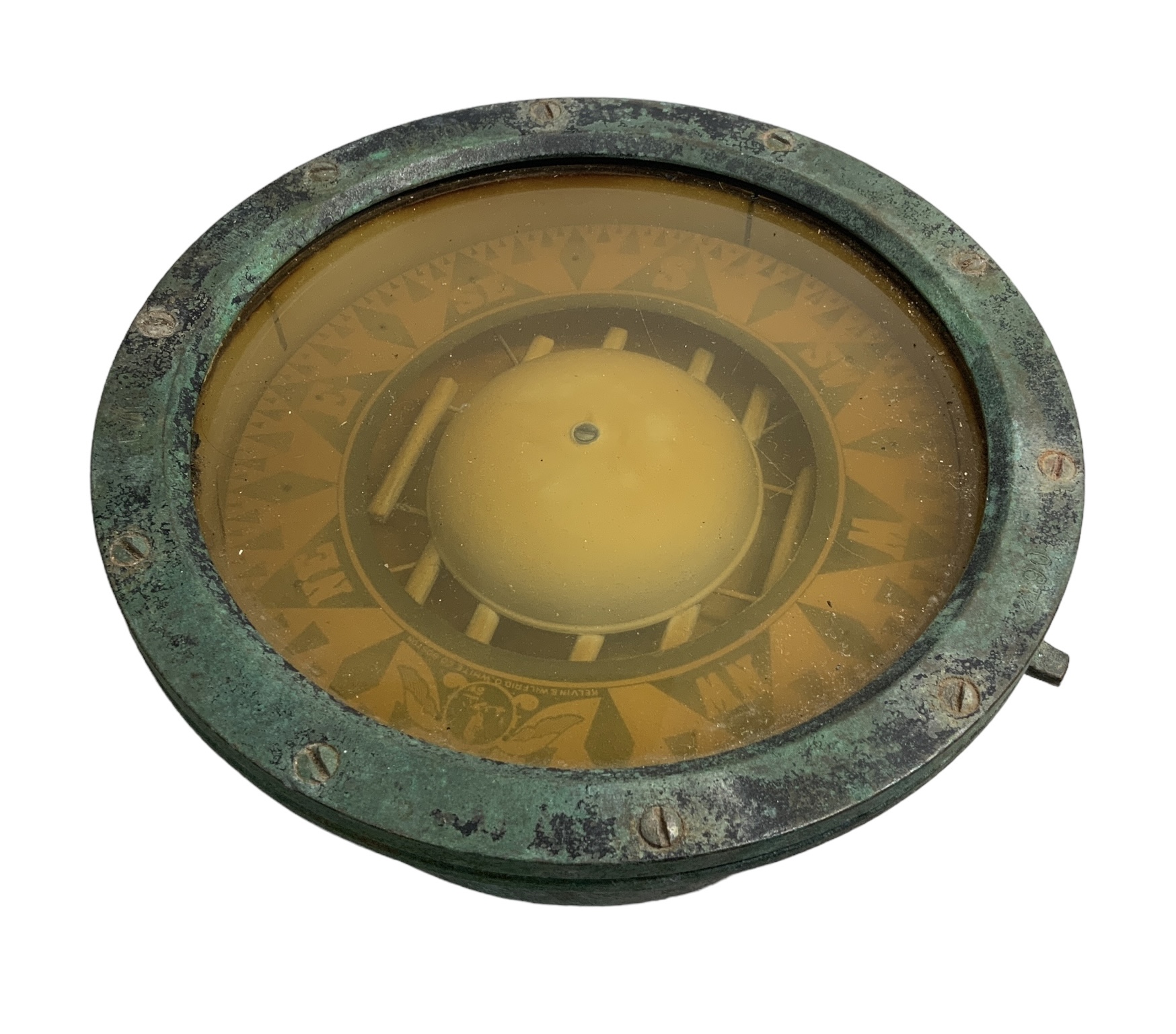 Antique Bronze Ships Gimbal Compass Made By Kelvin White Boston Nautical Equipment. In good used condition. It is 8.5” in diameter and 4.25” tall.