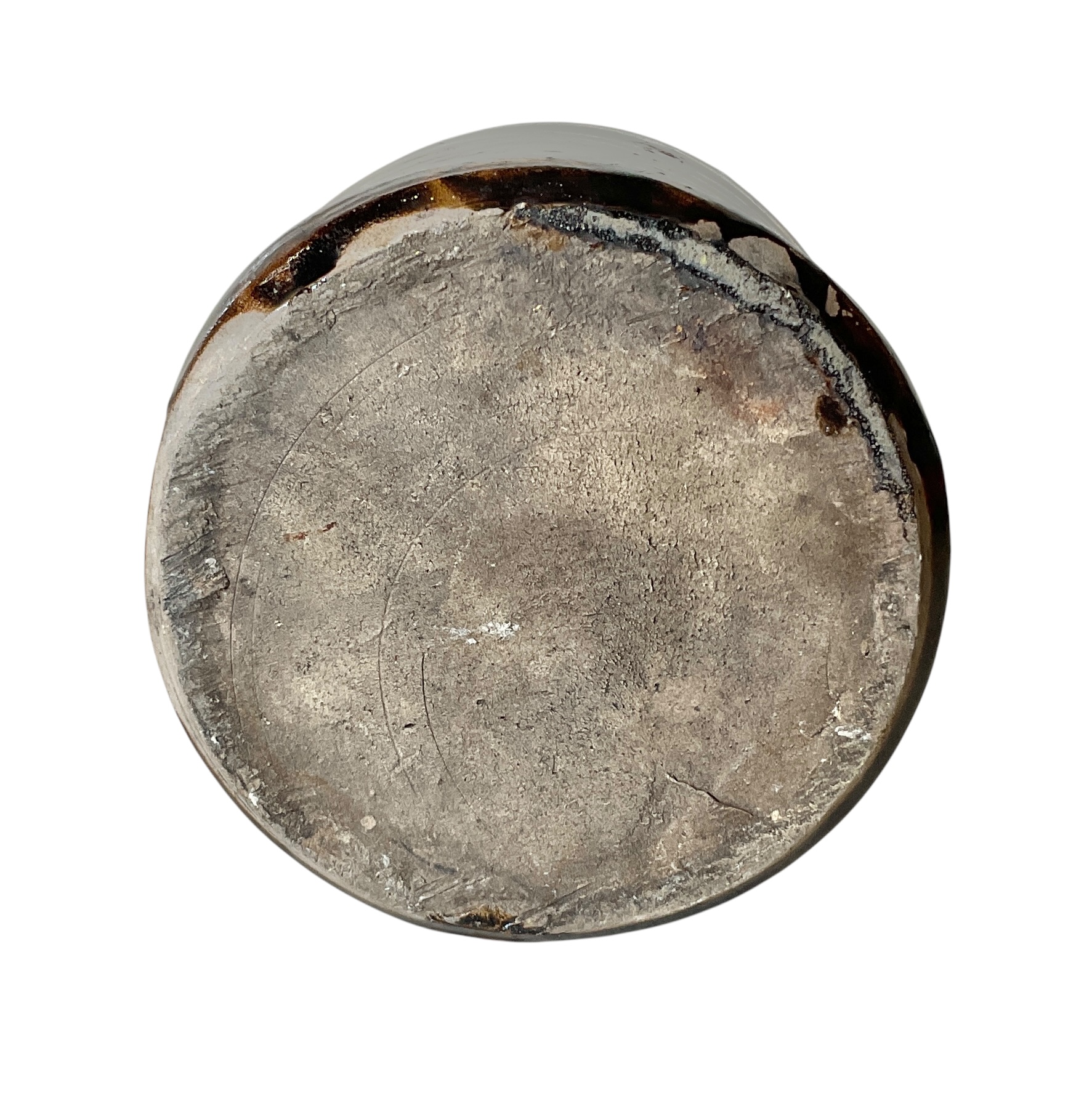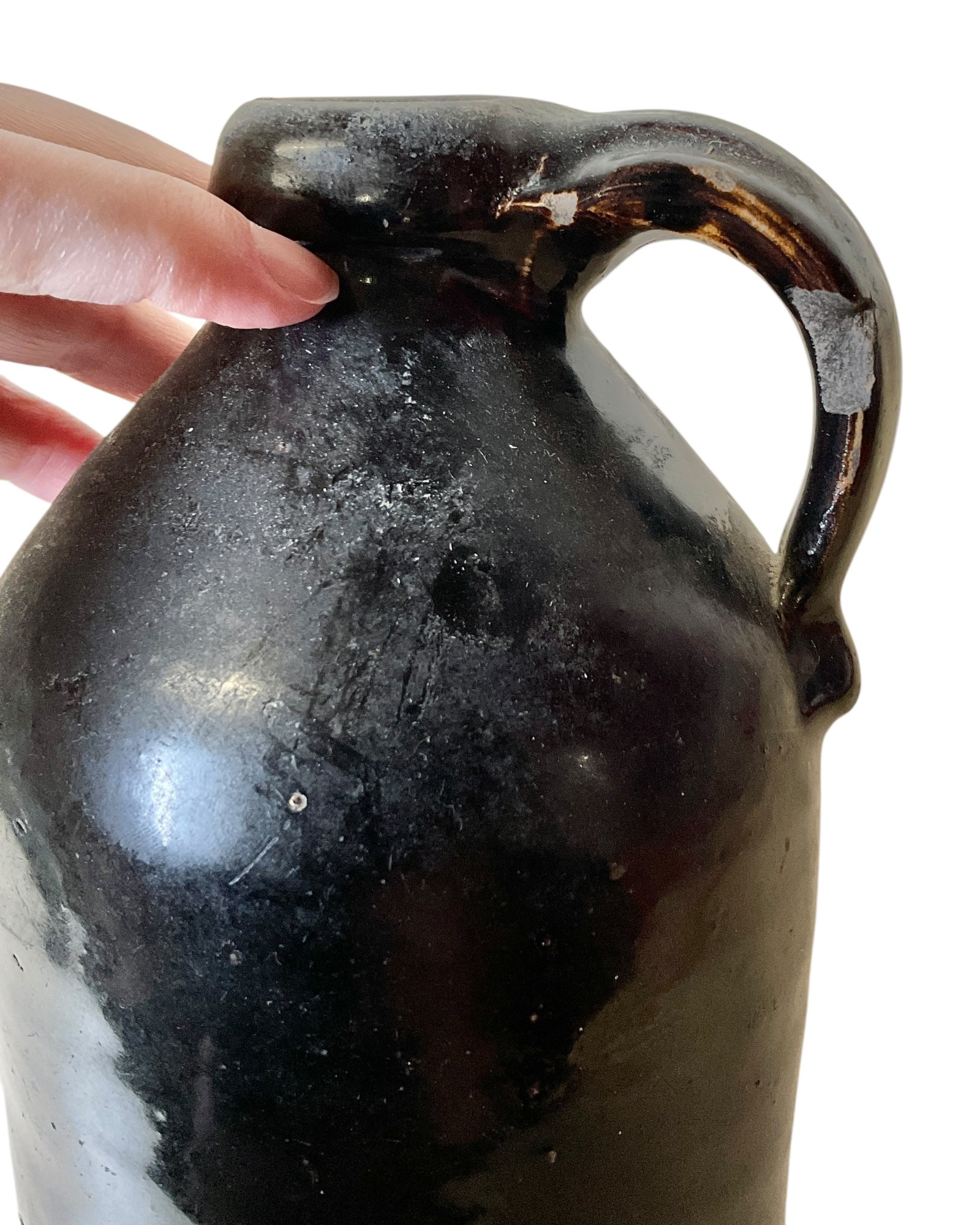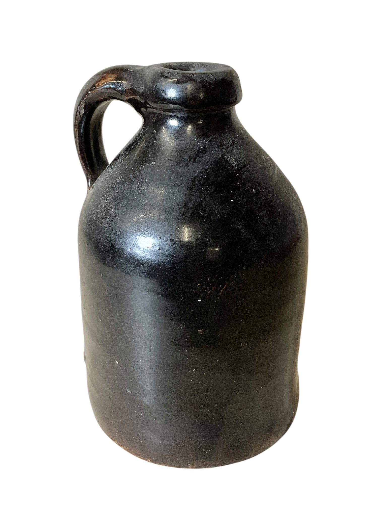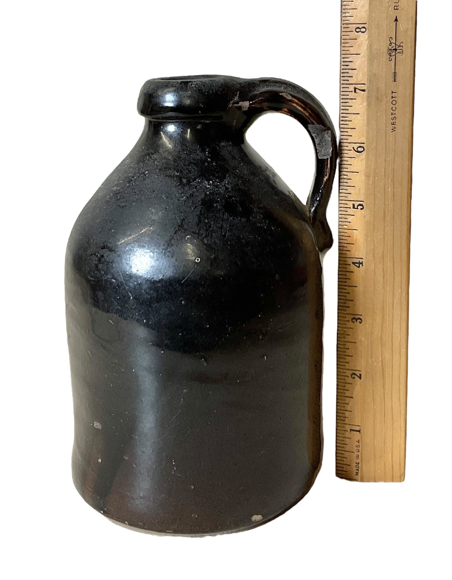Antique Brown Stoneware Jug. Jug shows signs of age with some cracks and chipping, most notably on the handle. There is also a small hole in the glaze of the body. Please see photos for more details. Jug measures approximately 7.5” tall.