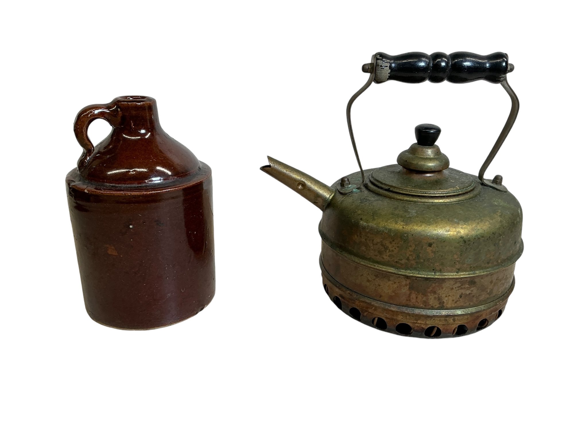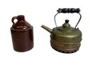 Antique Brown Stoneware Liquor Jug And Brass Simplex Kettle. In good used condition. The kettle is approx. 9.75” tall.
