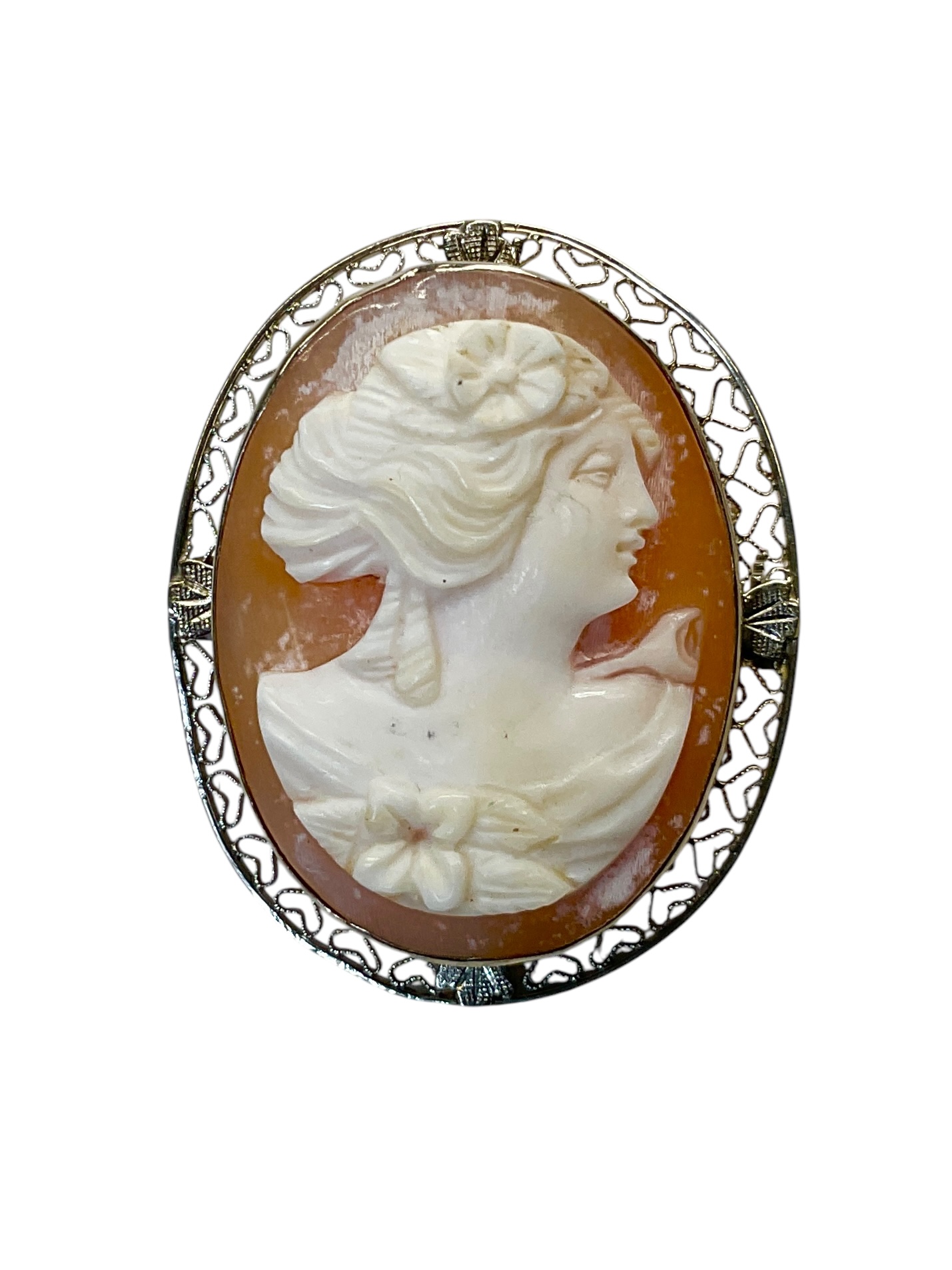 Antique 10K White Gold Cameo Pin, measures 1.25” tall, weighs 3.4 *TOTAL dwt. Marked 10K on the clasp.