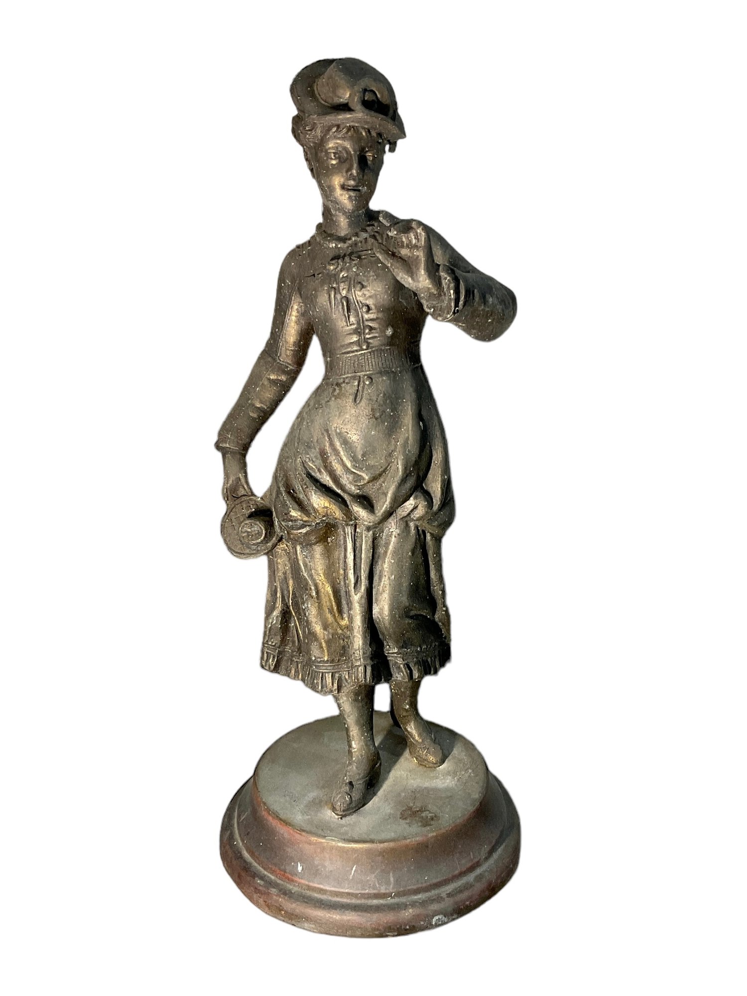 Antique cast Metal Young Woman Statue. 10” tall.