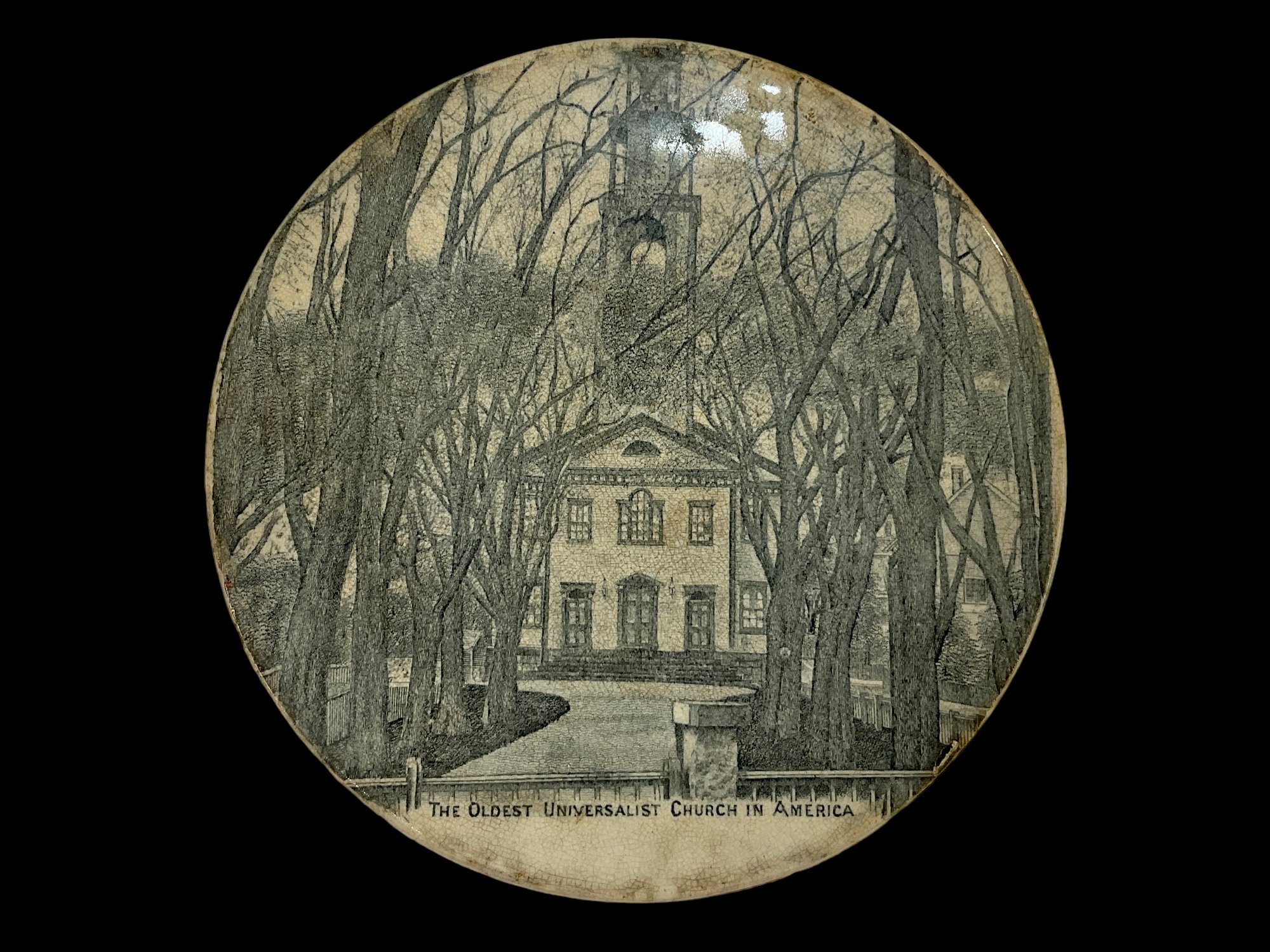Porcelain Plate Oldest Unitarian Universalist Church Gloucester MA. Measures 6" in diameter. See small fleck in the glaze in photo.